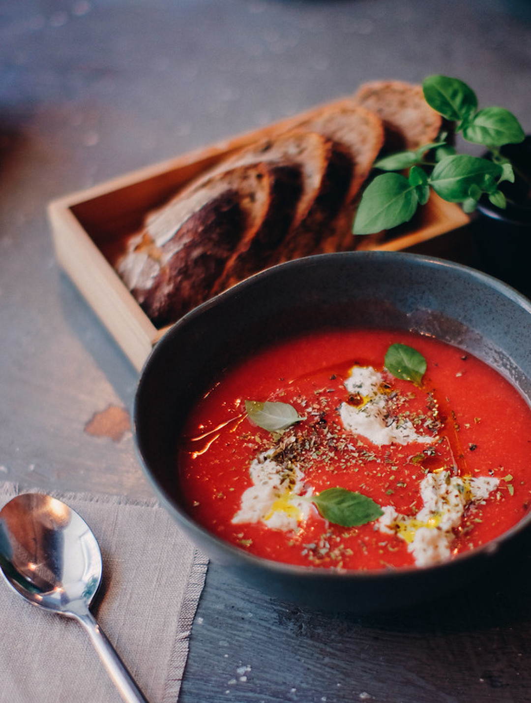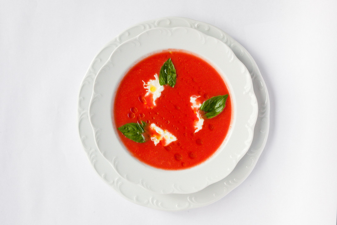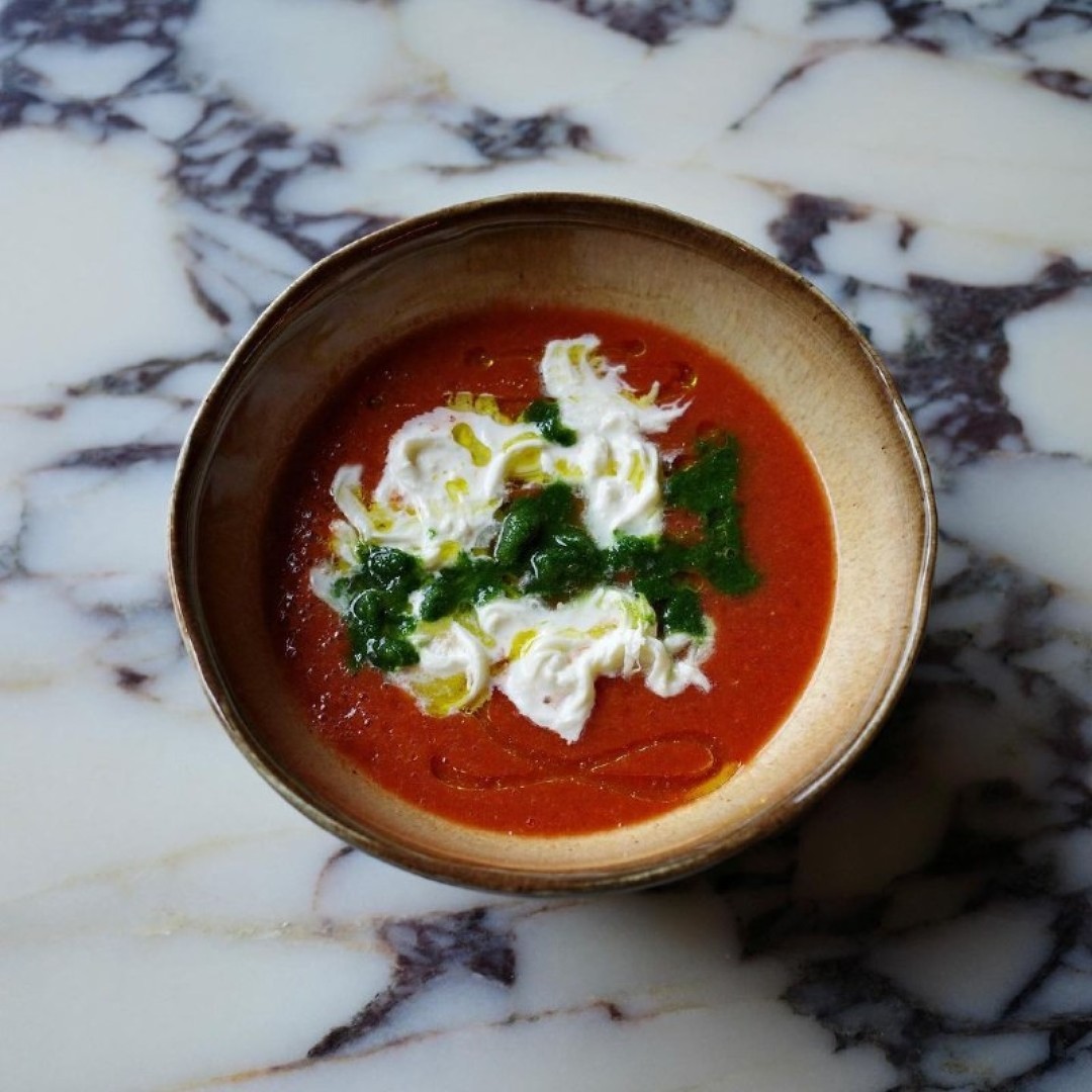Летний хит в ресторане Арама Мнацаканова держится уже несколько лет: холодный суп (790 руб) из помидоров с домашней бурратой, базиликом и оливковым маслом.