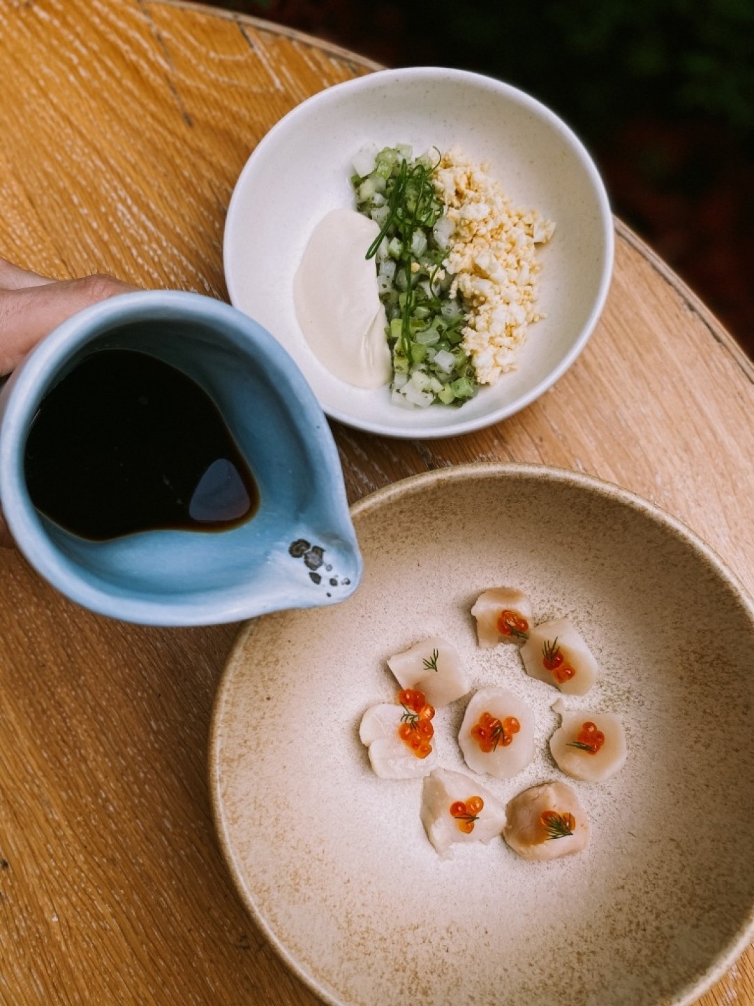 Многосоставная окрошка (550 руб) с гребешком, красной икрой и томатно-соевым бульоном особенно хороша на недавно выстроенной террасе.