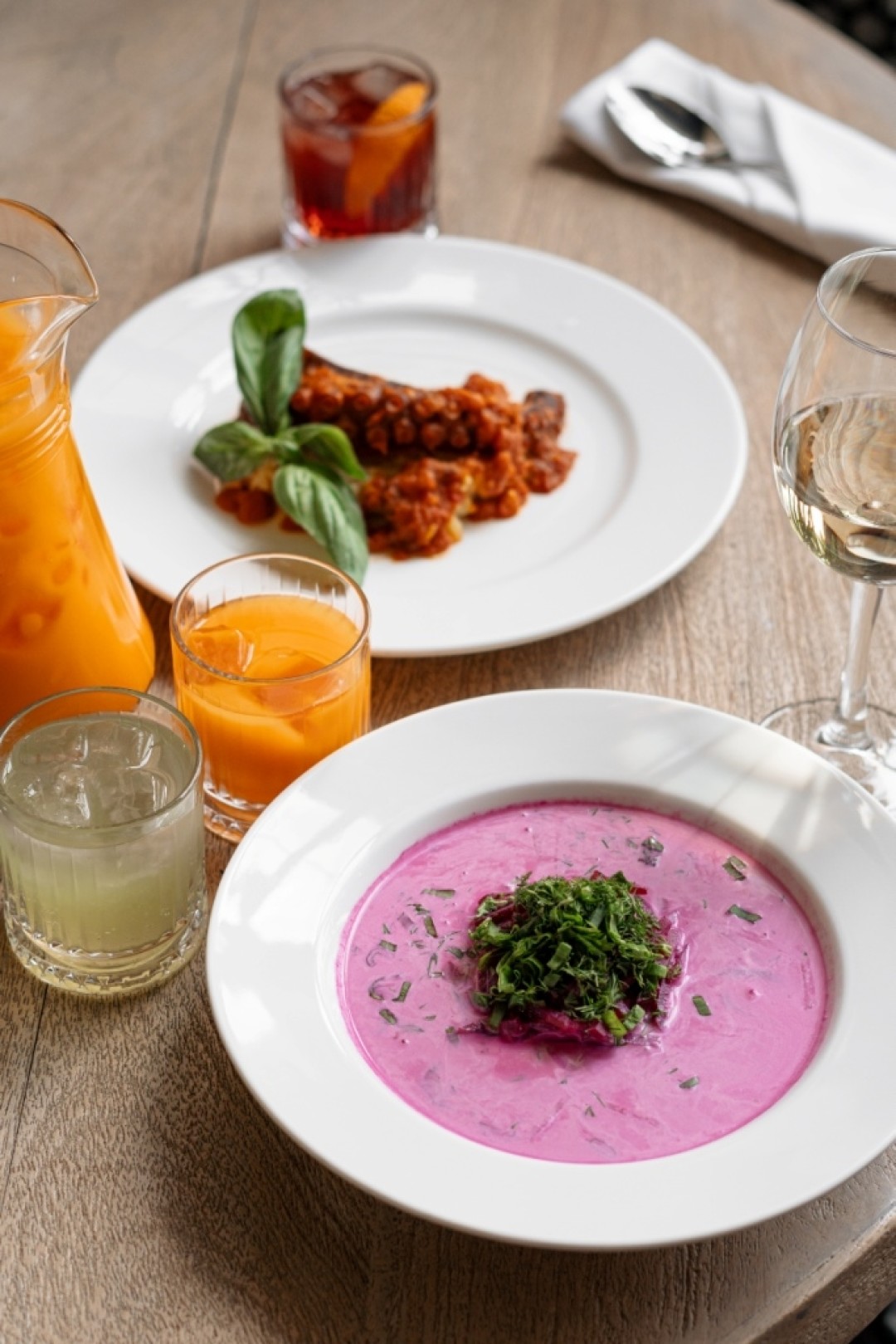 Шеф-повар(ка) Маша Дементьева подает холодные супы в двух вариациях: томатный со страчателлой и эстрагоном (390 руб) и цитрусовый с персиками и домашним йогуртом.