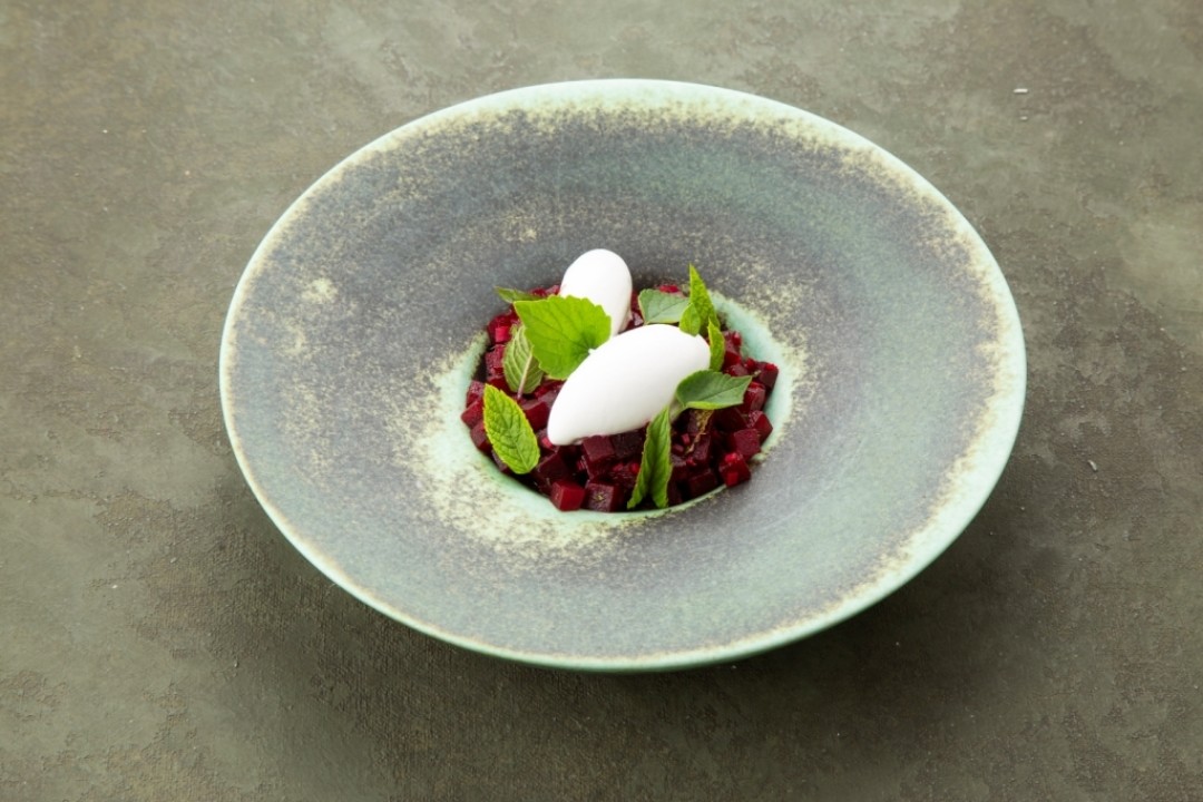 Шеф-повар Артем Гребенщиков моделирует вкусы как будто в 3D — так многогранно раскрываются они в его блюдах. Тартар он собирает из печеной и маринованной свеклы, заправляет оливковым маслом с кумином и аранжирует четырьмя видами мяты — дикой, шоколадной, перечной и сорта лофант. Завершающая нота — сорбет из кокоса.