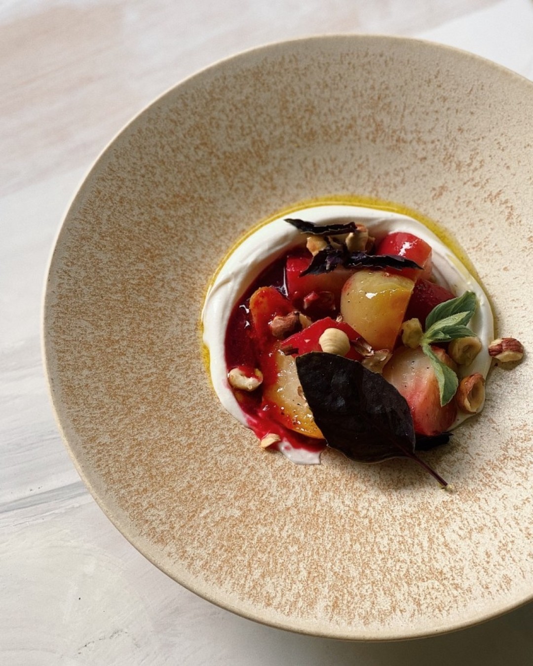 У шеф-повара Алескандра Пименова на ферме ресторана выросла желтая и розовая свекла и тут же пошла в дело. Ее запекают, заправляют хересным уксусом и оливковым маслом, выкладывают на крем из своего же шевра, сверху — обжаренный фундук, свежий базилик и выпаренный вишневый сок.