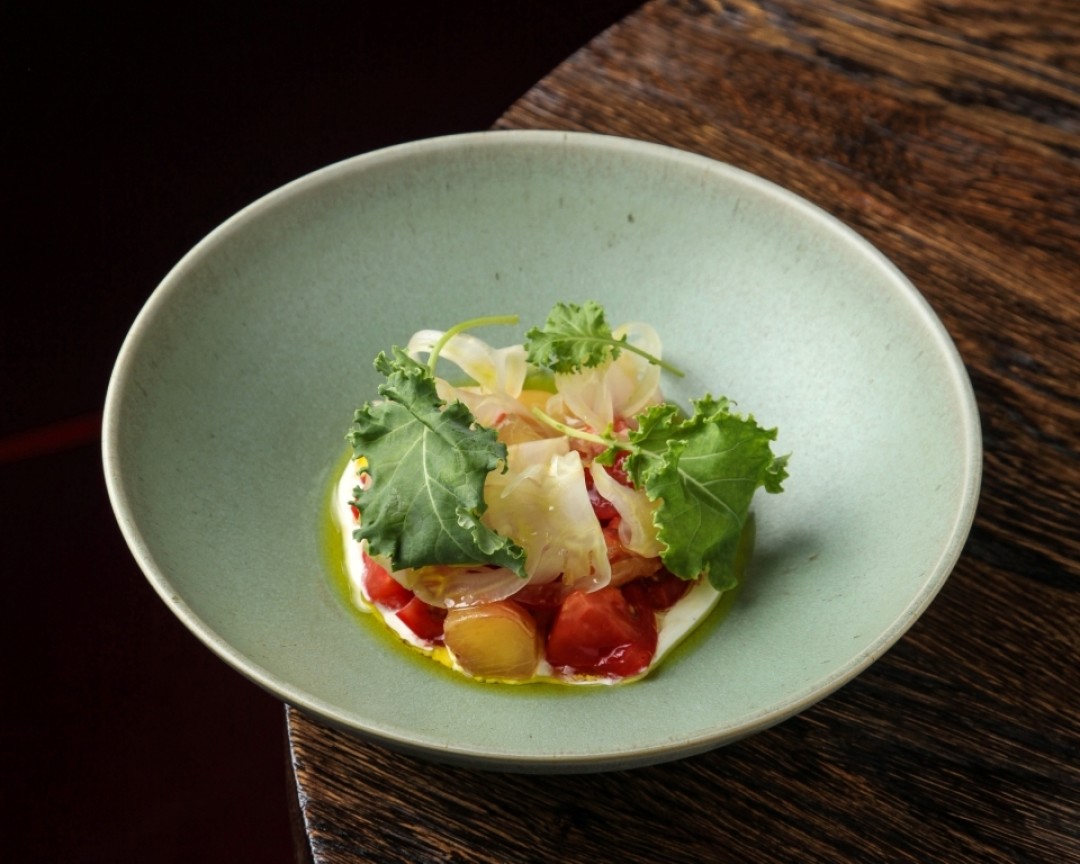 Яркие и сочные помидоры от фермы «Лето Хутор» шеф-повар Антон Абрезов нарезает большим кубиком и соединяет со сладкими персиками и фенхелем. Чтобы сбалансировать харизматичные вкусы этих трех продуктов и связать их воедино, в ход идет сливочный соус с тимьяном и мускатный орех.