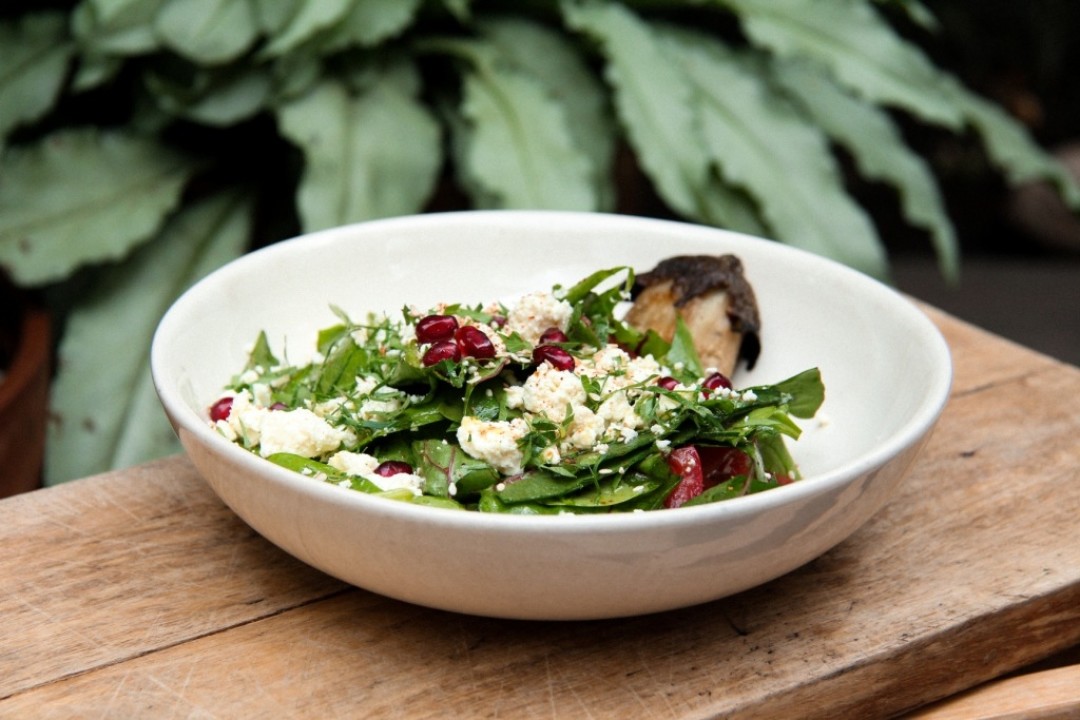 Маститый московский шеф Андрей Красов всегда отсыпает овощам красок щедрой рукой. Запеченный баклажан он дополняет кунжутным соусом тахини и подает с салатом из узбекских томатов, свекольной ботвы, шпината и маринованного крымского лука. Дальше — больше: сверху еще сыр фета, зерна граната и шичими.
