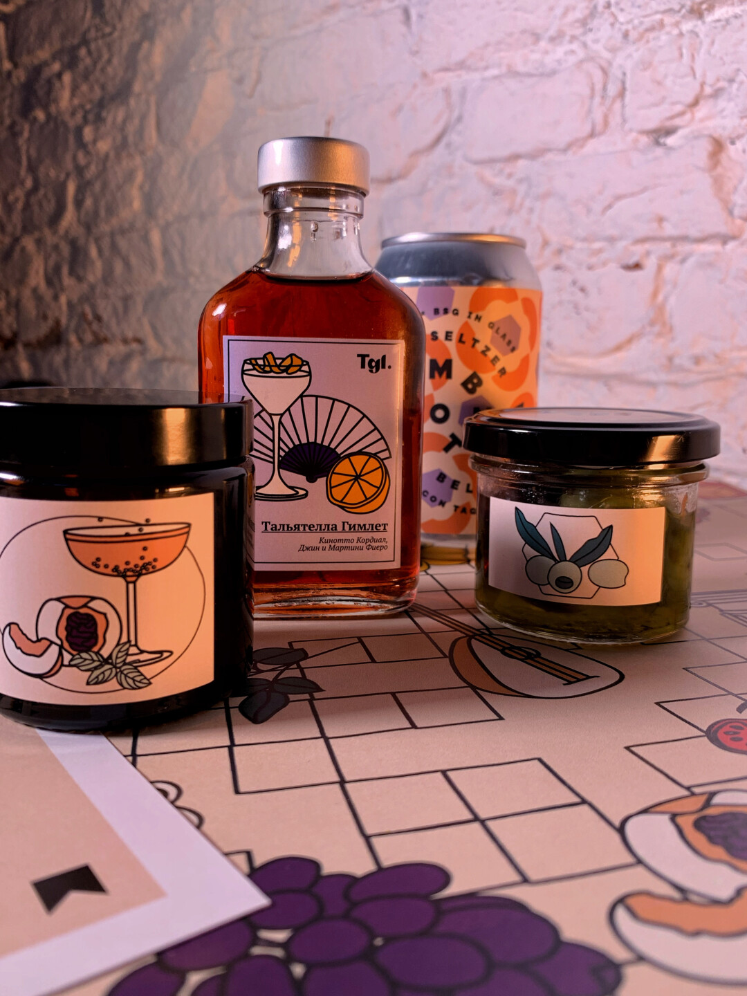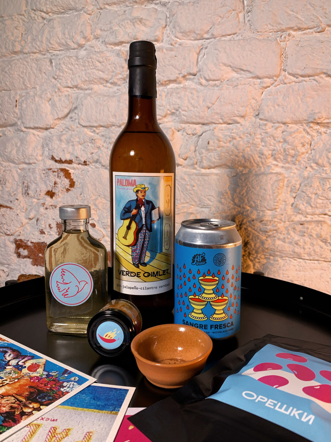 Три набора подготовила самая титулованная барная команда Восточной Европы от своих сайд-проектов: русский (Tselovalnik) с водкой, артишоками и парой фарфоровых стопок от ЛФЗ; мексиканский (Paloma Cantina) с бутылкой коктейля, фирменной капитой и порцией текилы; итальянский (Tagliatella Caffe) с гимлетом и негрони, свечой с ароматом беллини и порция граппы. В каждом дополнительно найдете соответствующий плейлист!