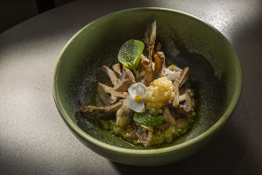 Весеннее меню шеф Виктор Гусев разнообразил двумя блюдами с включением корюшки: татаки из козленка с кремом из жареной рыбы и орзо с корюшкой, баклажаном и черным чесноком.