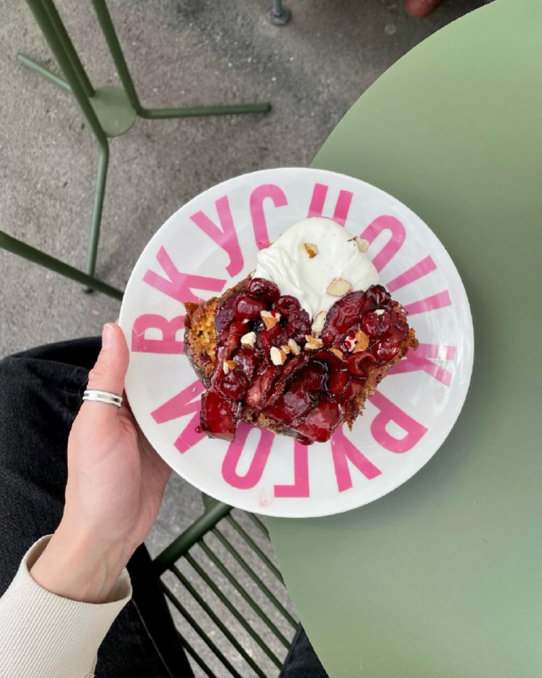 Всем уставшим от сырников и яйца пашот на завтрак посвящается! На Василеостровском рынке можно попробовать новый вариант сытного утреннего блюда: бекон и сладкая вишня на тосте с кремом маскарпоне и дробленым миндалем.