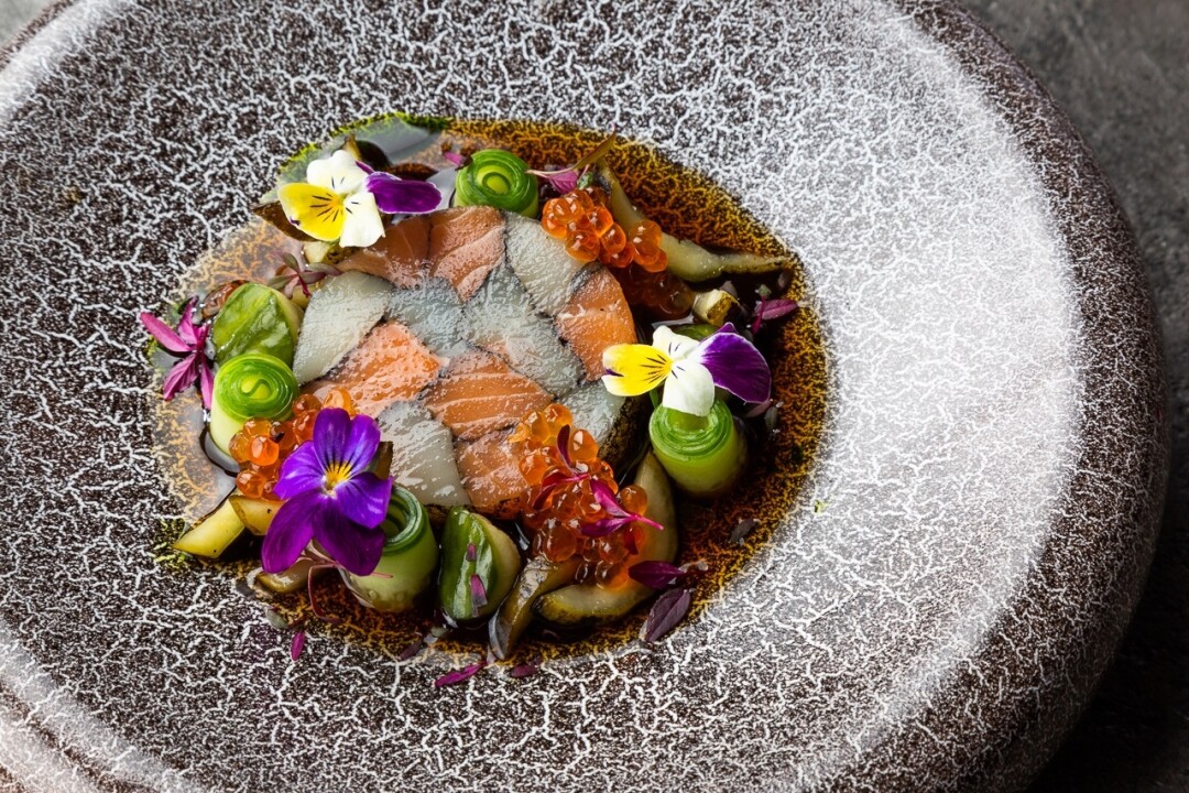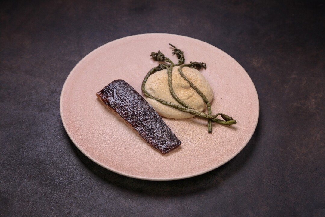 Сибирского муксуна с лососем готовят при низкой температуре так, что за счет коллагена кусочки рыбы склеивались между собой, образуя мозаику, контуры частей которой подчеркивают золой из порея. Подают террин с соусом понзо с шисо и красной икрой.