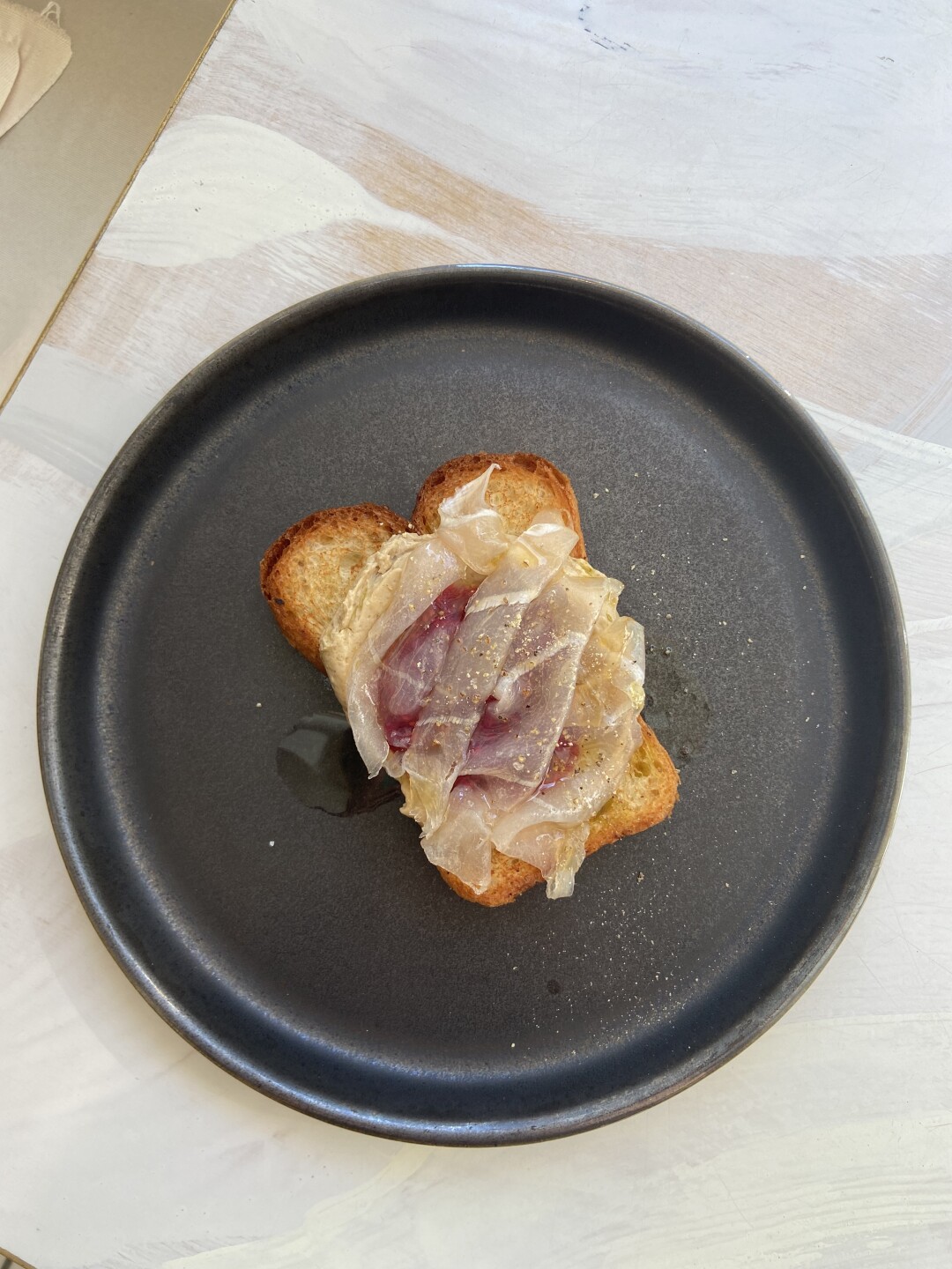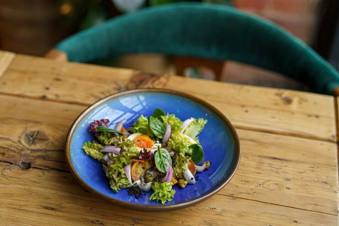 У Игоря Гришечкина балтийская килька становится драгоценным анчоусом: их тщательно отбирают, чистят и подвяливают рыбным гарумом. В салат с ними собирают мягко сваренное яйцо, картофель стоун, томаты, соус из сайры и зелень с цитрусовой заправкой.
