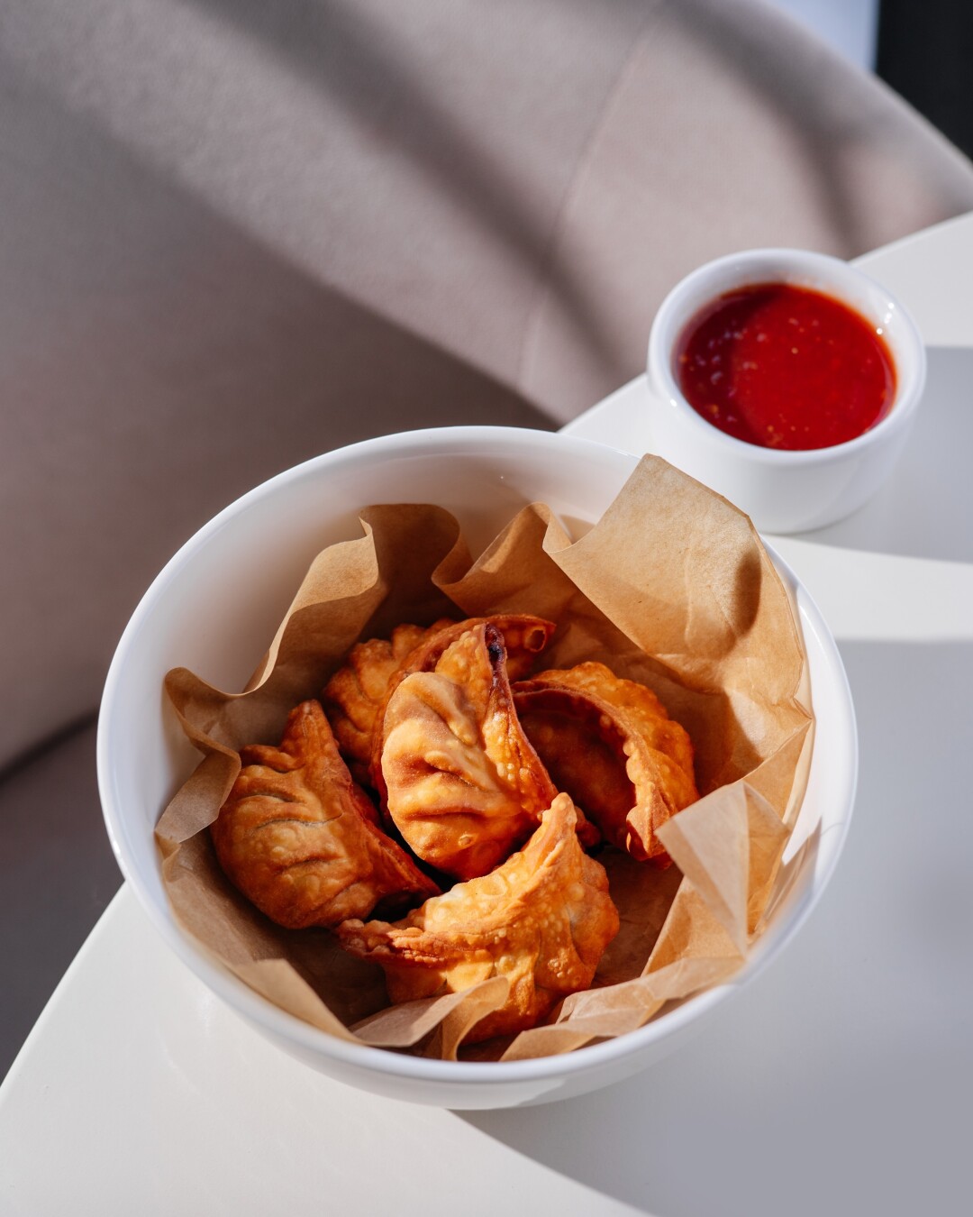 В премиальном ресторане люксовый лоск навели даже на чебуреки, сделав эдакий гастрономический каламбур. В начинке у них камчатский краб, конфи из лука порей со сливками, тимьяном, рыбным бульоном и белым вином, а подача с соусом из манго.