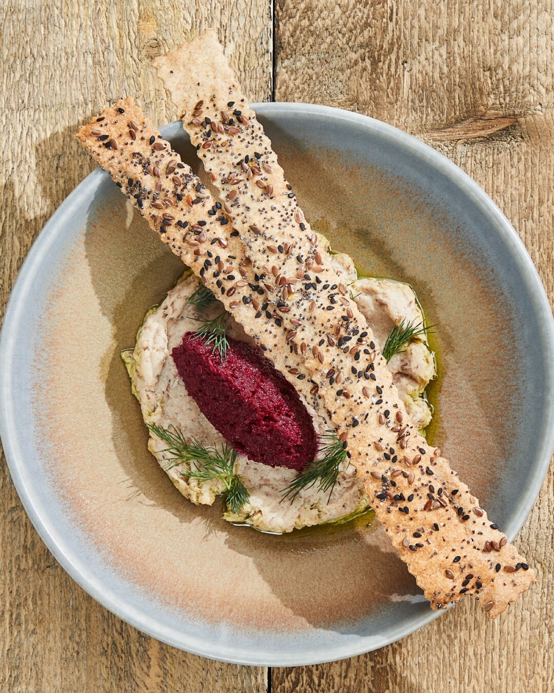 Филе ростовского карпа шеф Станислав Левохо пробивает с тимьяном и топленым маслом. И к нежному по вкусу и текстуре риету готовит контрастное сопровождение — хреновину со свекольным фрешем и уксусом. Плюс домашние крекеры и укропное масло.