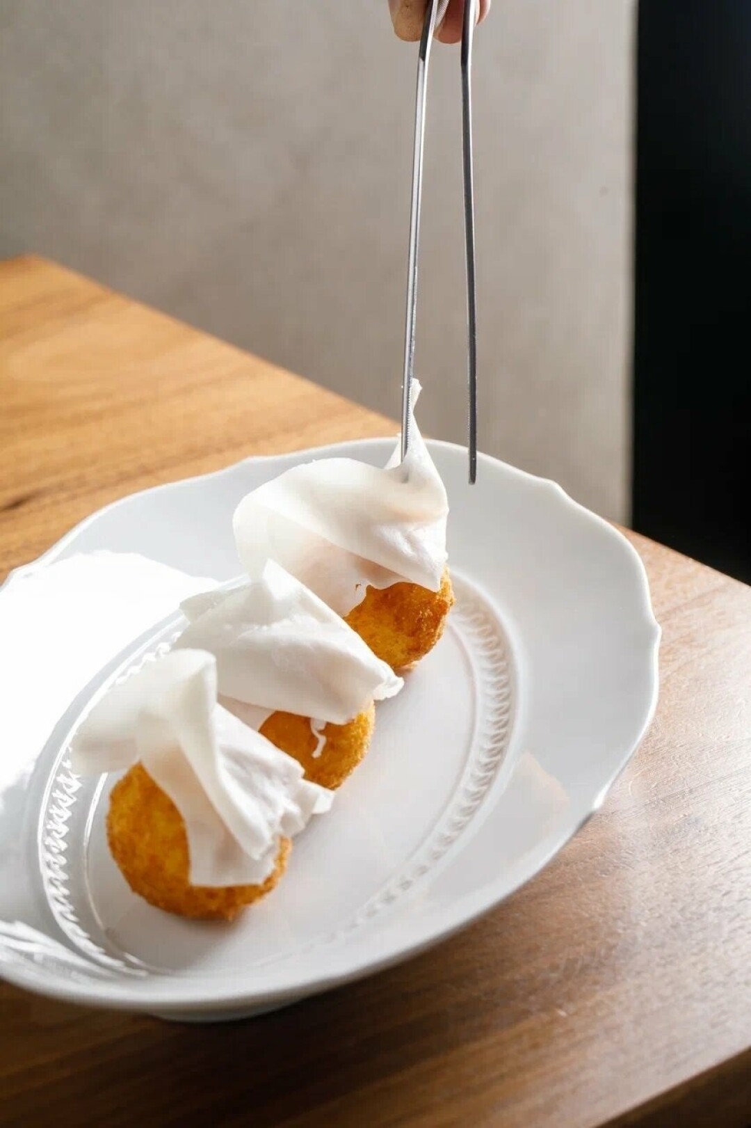 Шеф-повар Дмитрий Блинов точно знает: все гениальное просто. Как его горячие крокеты из картофельного пюре с пармезаном, обжаренные фритюре, на которых подтаивают невесомые, на манер лардо, ломтики сала с Мальцевского рынка. Лучшая закуска!