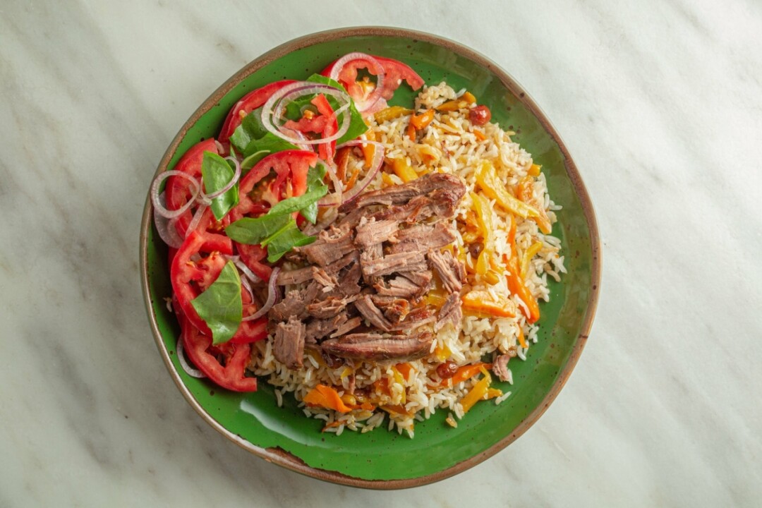 В гастрономическом пространстве Balagan готовят настоящий узбекский аутентичный плов — на огне, в столитровых казанах. На рисе лазер из Узбекистана, с окороком ягненка, желтой и красной морковью, чесноком, перцем чили, зирой, изюмом и хлопковым маслом.