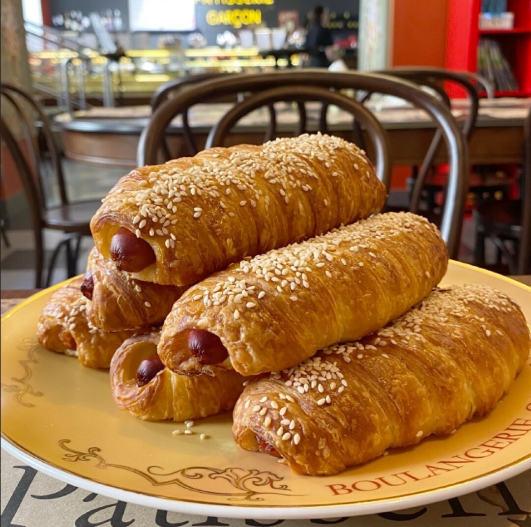 Великая! Симбиоз теста знаменитых круассанов из старейших кондитерских Петербурга и венской сосиски ручной работы, ее особого размера специально для Garcon изготавливает «Великолукский мясокомбинат». Сверху поджаренный кунжут, макать в пряную горчицу.