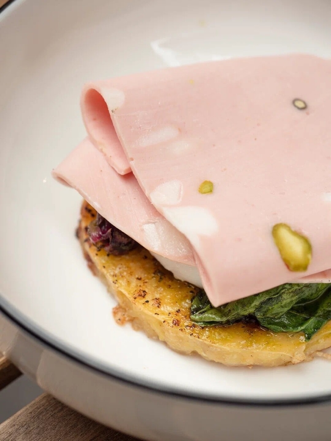 Все, кто не мыслит утра без хашбрауна, ходят за его ресторанной репликой в сеть хитовых кофеен. Картофельную шайбу запекают и жарят во фритюре, выкладывают на него шпинат с мятным песто, поливают трюфельной бешамелью, поверх пашот и мортаделла.