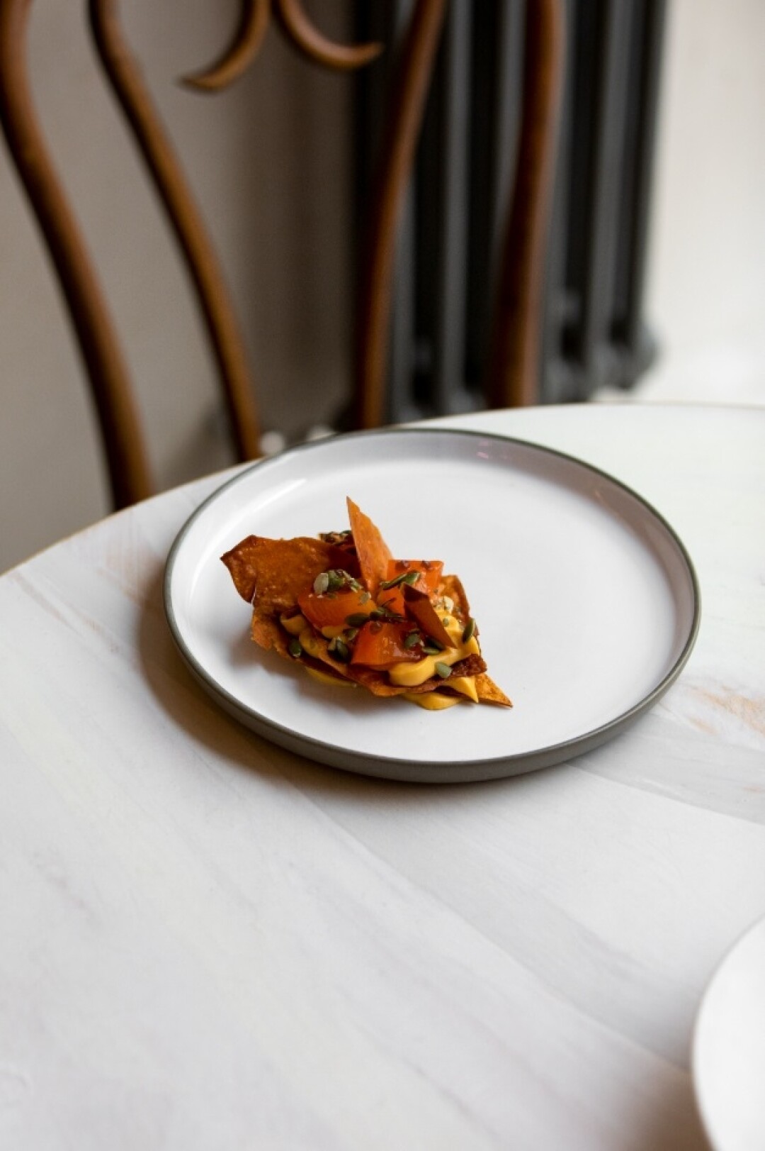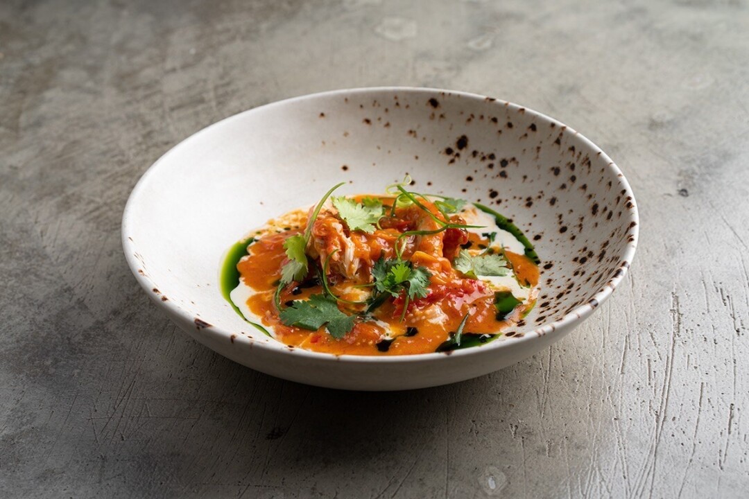 Нерушимое правило: все сезонное в первую очередь появляется в ресторане Meal. Хурму, например, команда поженила с крабом, прогретом в соусе из домашних вяленых томатов с ферментированным чили. Подают со страчателлой, а украшают кинзой и ароматным зеленым маслом.