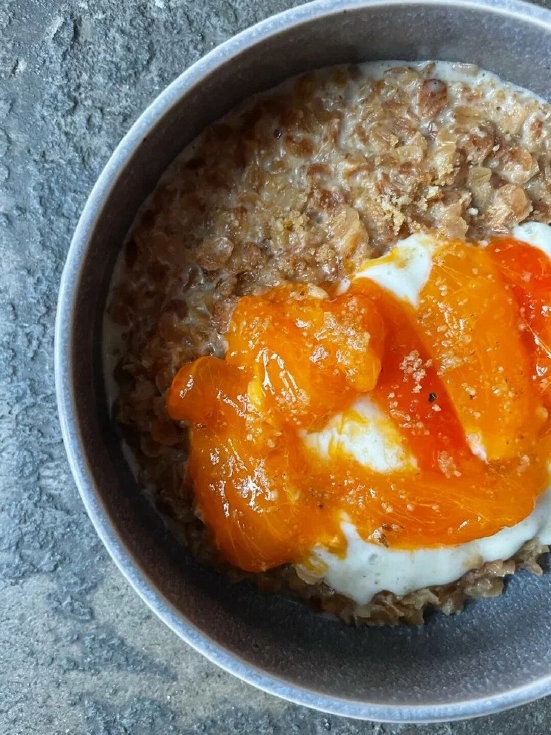 В обновленном меню завтраков появилась запеченная овсянка с пряным кремом и хурмой. Овсяные хлопья предварительно запекли в печи вместе с медом и маслом, затем дополнили заварным кремом с гвоздикой и корицей и грильяжем из грецкого ореха.