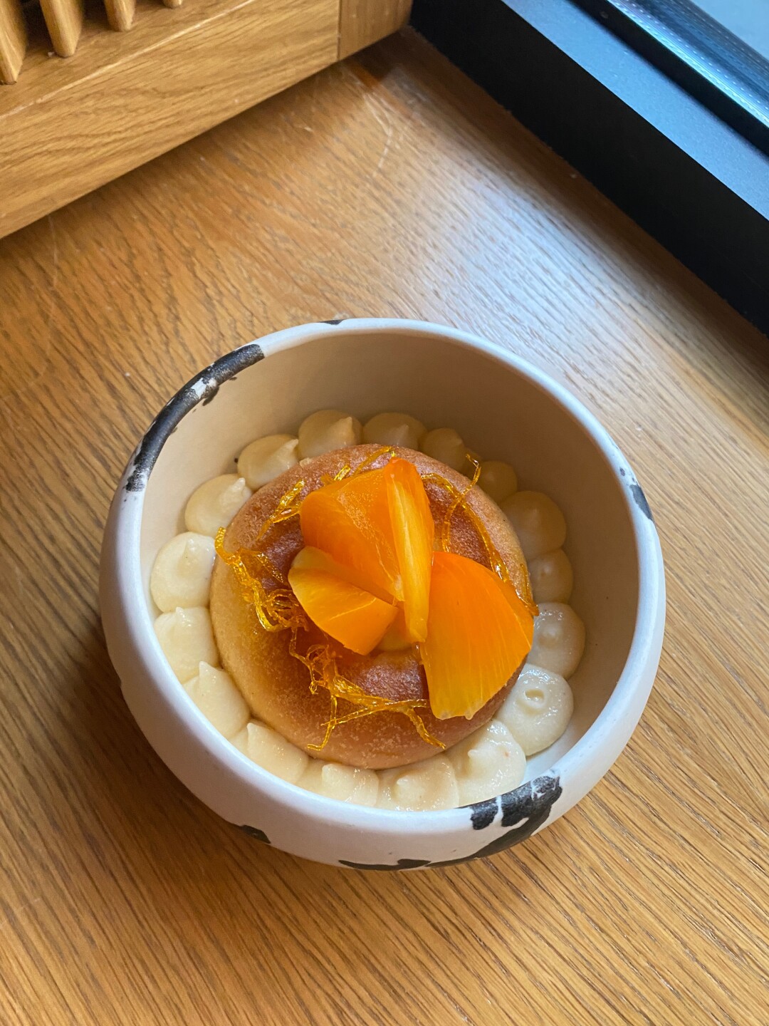 Ромовая баба с изящными, выверенными нюансами: подушка из заварного крема, цукаты и сочные слайсы хурмы.