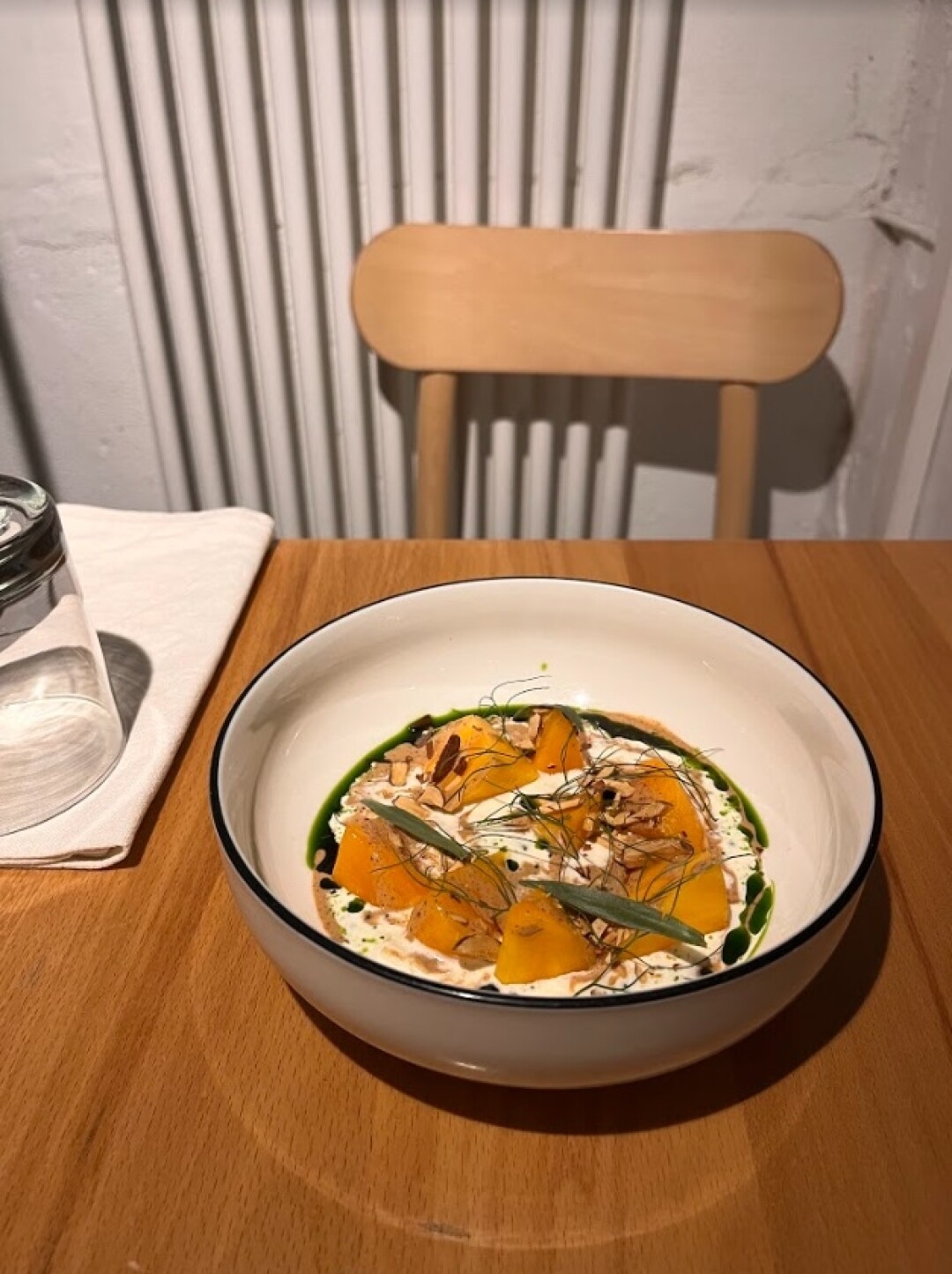 Все лучшее, что есть в хурме, подчеркивают фермерской страчателлой, миндалем, а из свежей мяты делают песто.