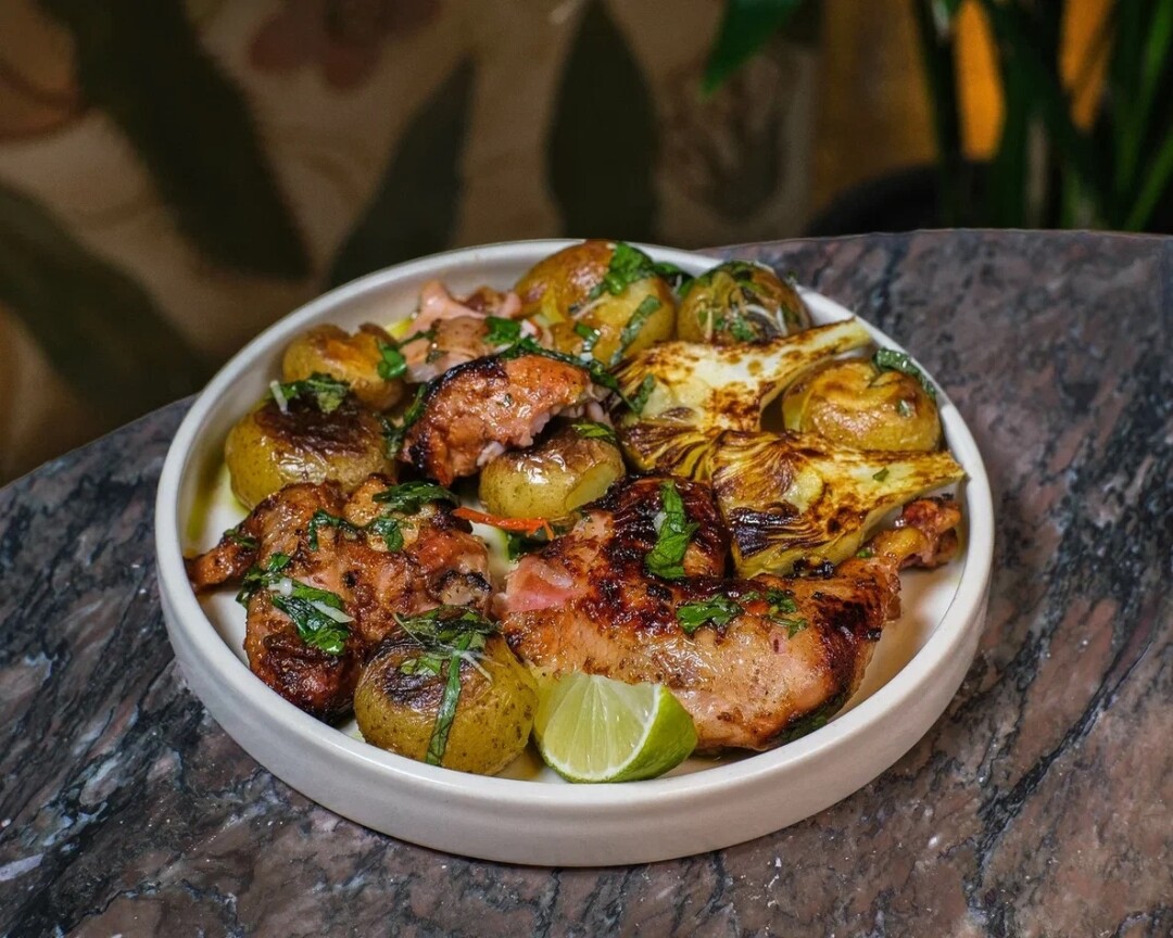 «Хуан» стали амбассадорами мема «какой бизнес — такой и ланч» и раздают нарядные обеды по будням с 13 до 17. Каждый раз разный суп и основное блюдо, которое готовится в испанской угольной печи или на открытом огне ротационного гриля, и специально подобранный бокал вина — сиеста is coming.