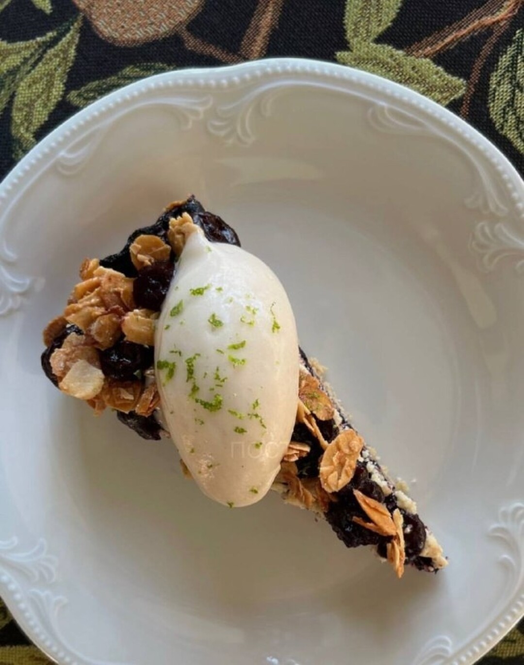 В панорамной AIKI TERRASA с видом на Большую Невку готовят четыре постных блюда: стейк из цветной капусты с тахини, запеченный баклажан с гранатом и песто из трав, гречотто с грибами и теплый морковный кекс, пропитанный лимонным соком, который подают с заварным кремом на миндально-кокосовом молоке.