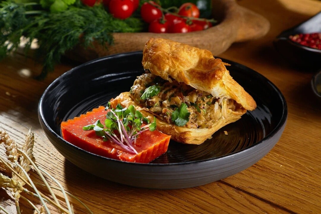 В меню выделяется вегетарианская лазанья с растительным мясом, классическим итальянским соус наполи и соусом бешамель из миндального молока. Вместо мясного фарша — смесь из соевых, гороховых бобов и риса.