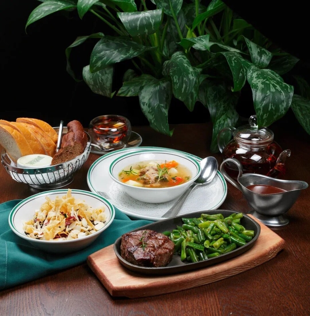 Что: честный и очень сытный ланч из трех блюд с напитком за 395 руб. включает на выбор салат с медово-лимонной заправкой или крабовый, суп-пюре из брокколи, щи с курой или из говядины с овощами, а на горячее — гуляш из свинины с гречкой, рыбные тефтели с пюре или куриный рулет.