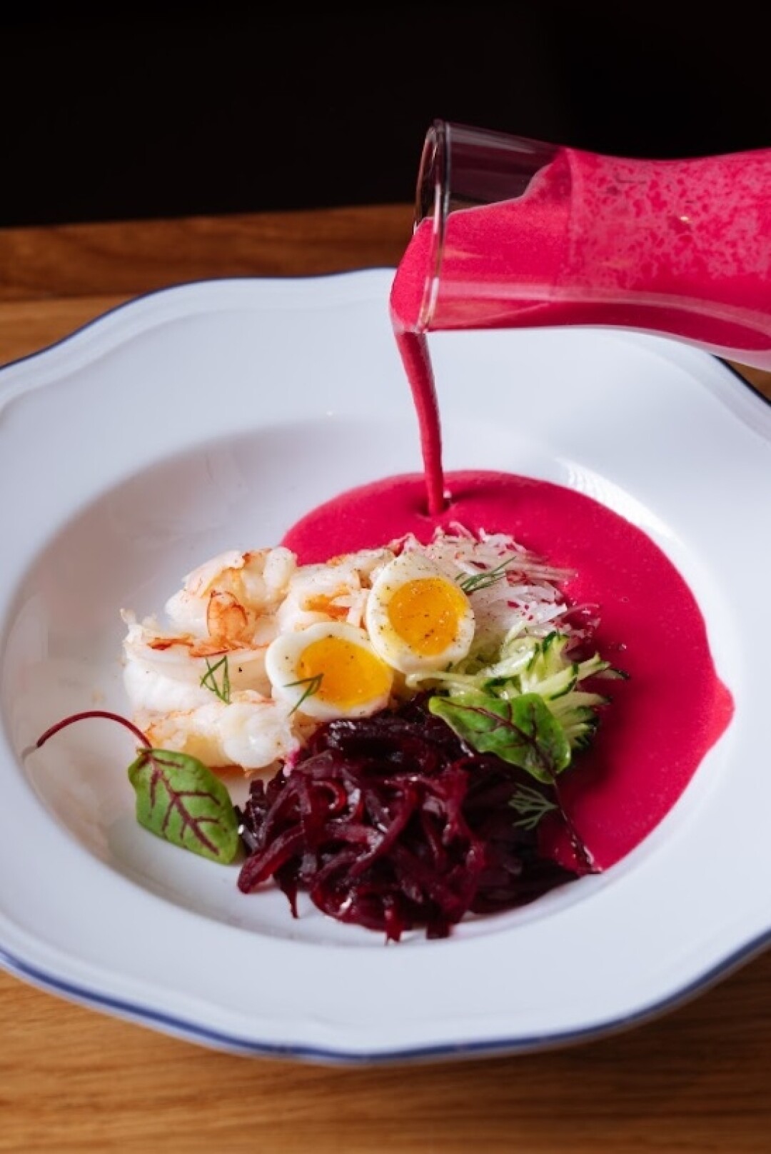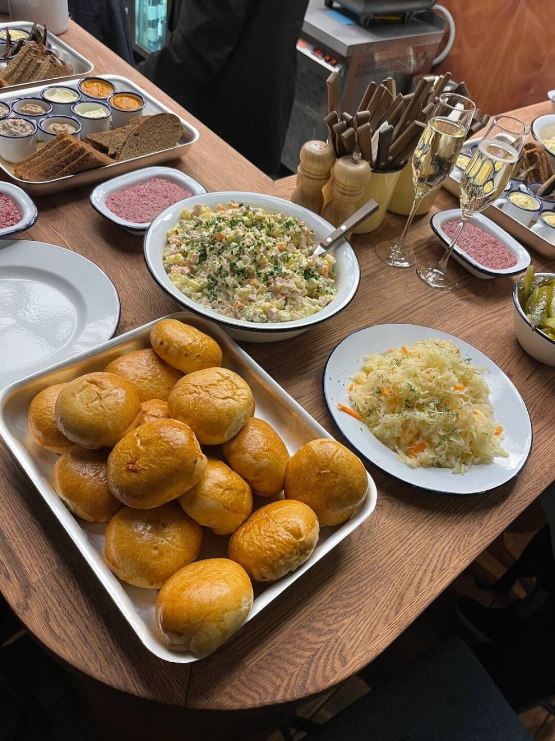 Нарядные русские завтраки с французским вайбом шеф-повар Владимир Лущик готовит ежедневно с 11:00 до 15:00. Пробуйте слоистую гурьевскую кашу с миндальным муссом, картофельный драник, фаршированный белой рыбой и сливочным сыром, на подушке из припущенного шпината или оладьи с красной и черной смородиной и кленовым сиропом.