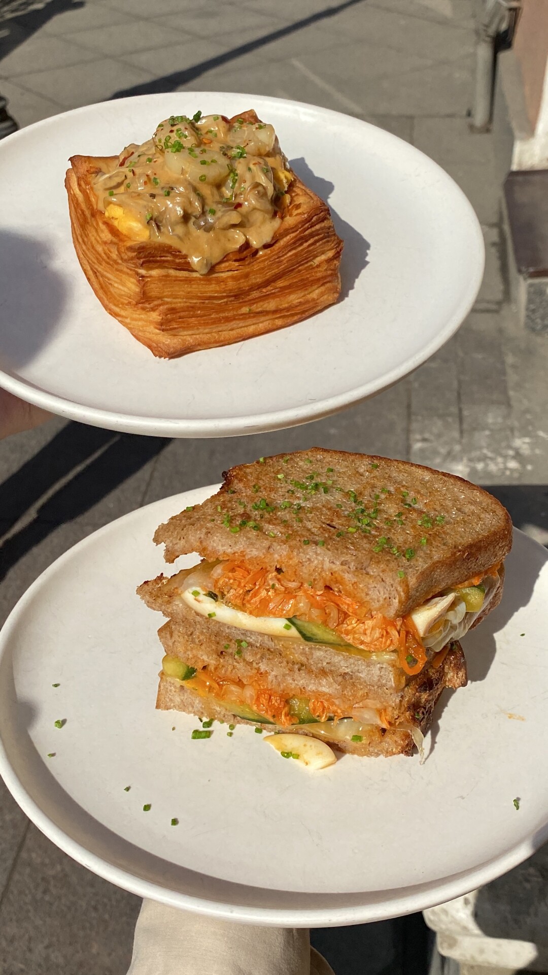 До 30 апреля есть шанс попасть на ограниченный завтрак-коллаборацию. Команды соединили свежие булочки, скрэмблы, яйца пашот, морепродукты в трех отдельных блюдах. Например, гриль-чиз с двумя тонкими кусочками хлеба тартин, между которыми обжаренная в кунжутном масле капуста кимчи, битые огурцы, маринованное яйцо, кокосово-устричный соус и тянущаяся моцарелла.