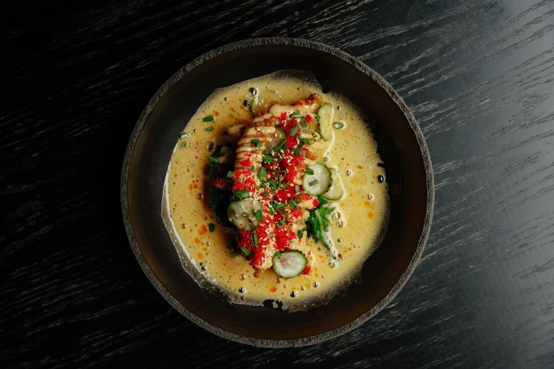 В азиатском ресторане Никиты Рендино и Романа Грачева (эксы московских ресторанов Eva и Lucky Izakaya) готовят главную рыбу Петербурга в качестве горячей закуски. Корюшка в темпуре с острым соусом голландез и красной икрой тобико.
