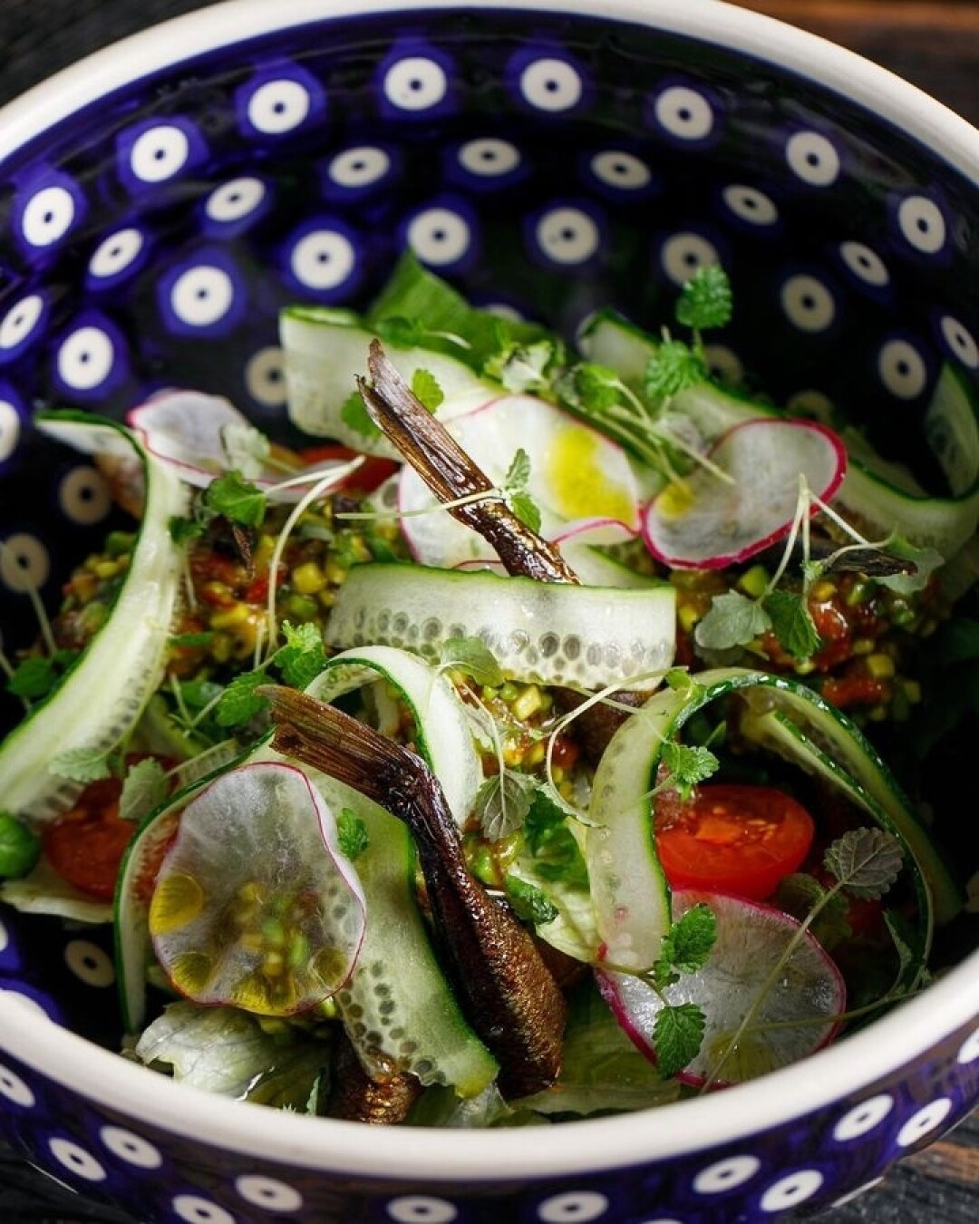 В рюмочной придумали лучшую закуску под ледяную беленькую: корюшку в кляре вместе с мятными огурцами — очень по-летнему.