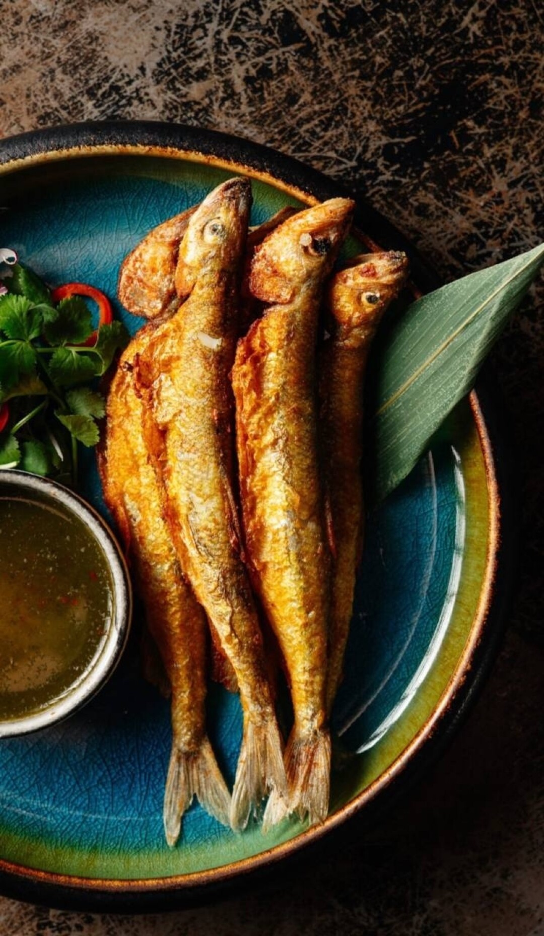 Корюшку на азиатский лад можно найти на Московском проспекте: жарится в масле до хрустящей корочки, сервируется с блюдцем соуса — тайского, рыбного, с красным луком, перцем, чили и кинзой.