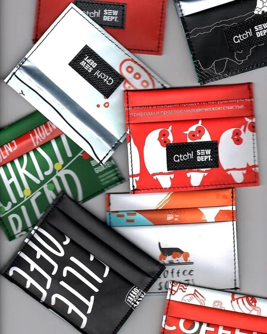 Ресайкл-кошельки в кофейне Gotcha! Приносите пустую упаковку от чая-кофе-какао — и из нее сделают классный бумажник.