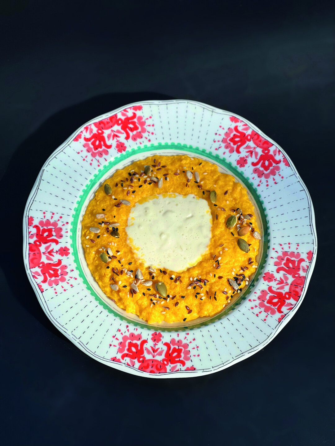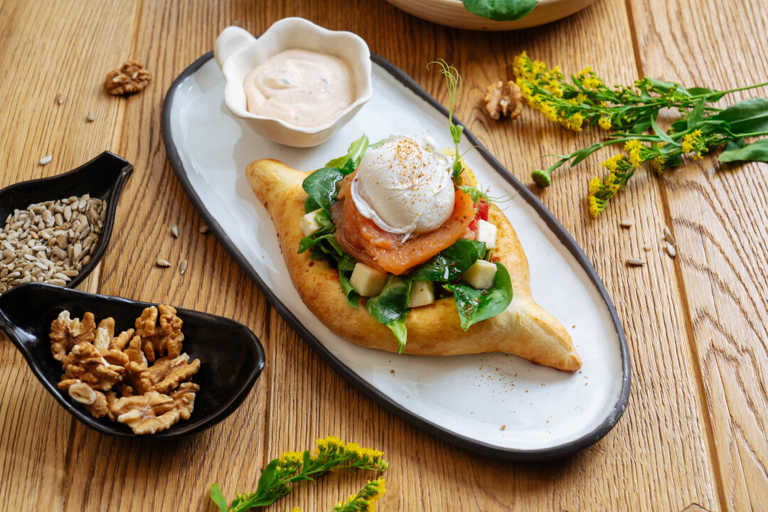 У Арама Мнацаканова в ливано-итальянском ресторане красота и волшебство: окна в пол, вид на Неву и Крестовский. На бегу вам нужен «Быстрый завтрак» с круассаном, а с толком и расстановкой — ленивые вареники по семейному рецепту шефа Mama Tuta Гиа Хучуа со сметаной и тутовым вареньем или с кокосовым молоком и сиропом из фиников.