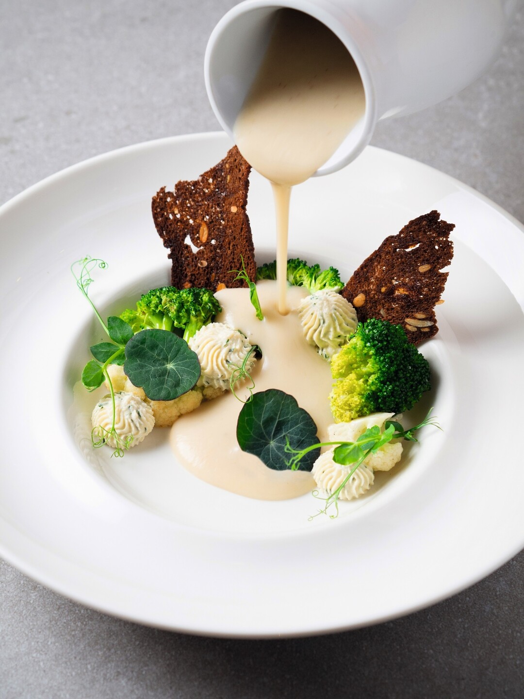 Большой панорамный (с роскошным видом на Финский залив, который дают рассмотреть в телескоп) ресторан на 15-м этаже в жилом комплексе «Я—Романтик». Русско-азиатское меню подойдет и вегетарианцам, и веганам. С утра кормят сырниками из тофу, на обед и ужин предлагают тайский карри с кокосовым тофу, поке с запеченной тыквой, темпе на креме из цветной капусты.