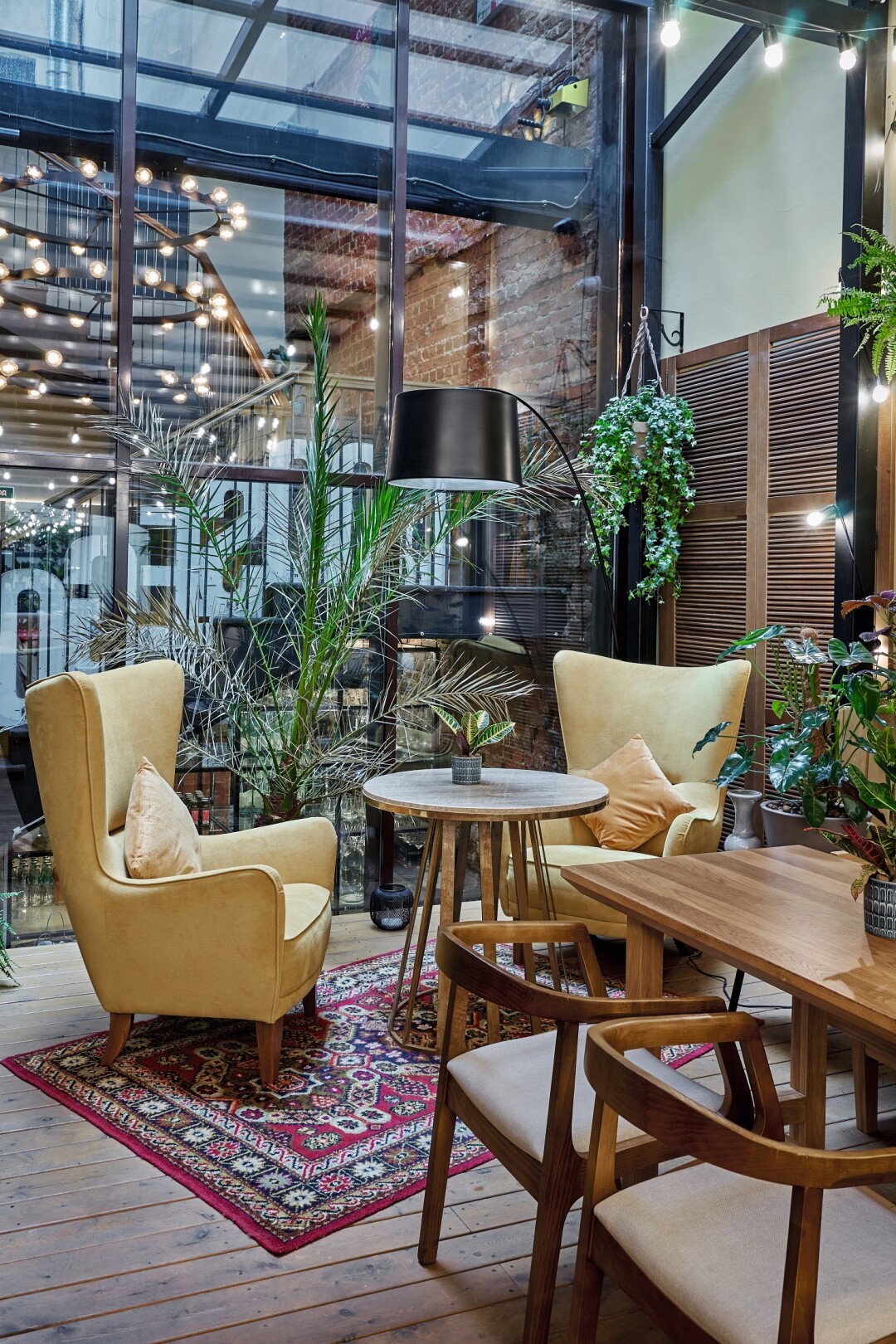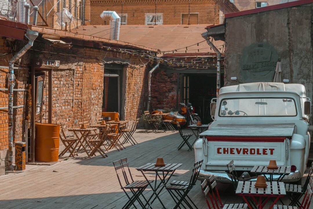 «Маленьким кусочком Нью-Йорка» называет креативное пространство свой двор — действительно, почему нет: для тех, кто хочет петь под дождем, есть пятиметровый зонт. А еще клумбы, скамейки, терраса ступенями у бара Laboratoriо Distillita, беседки у грузинского бистро Ezo.