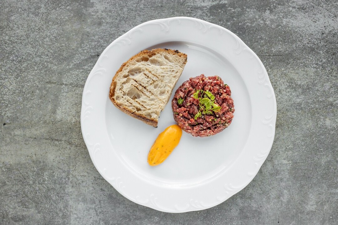 У Арама Мнацаканова как всегда сервис на недостижимой высоте: тартар предлагают в двух стилях на выбор — итальянском и французском. В первом в говядину идет только оливковое масло, соль и перец, во втором — еще каперсы, зернистая и дижонская горчица, рядом выкладывают желток из су-вида и обжаренную на гриле гренку.