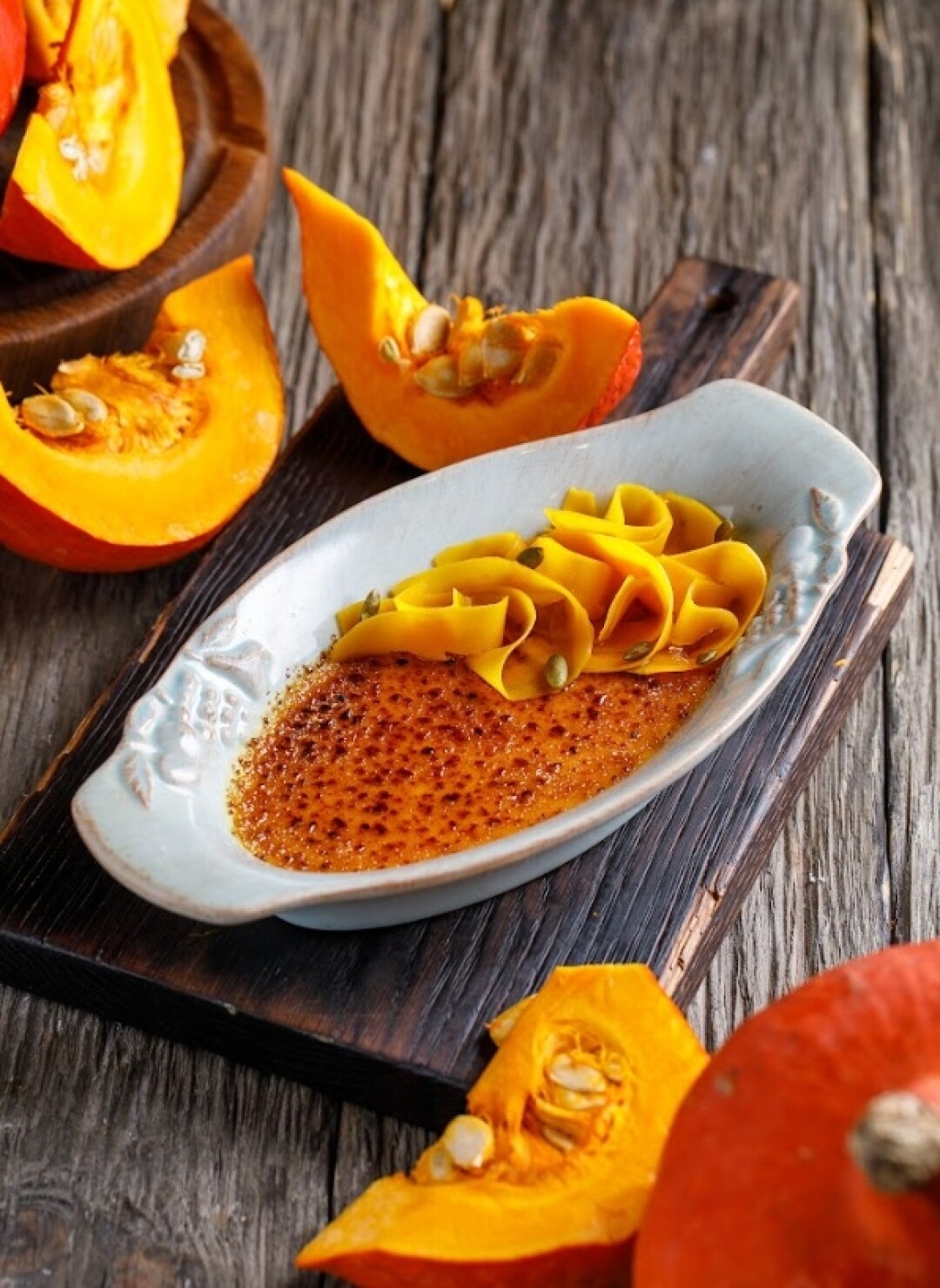 Занятнее всех сезонную тыкву «отработали» в ресторане «Сыроварня» Аркадия Новикова. Помимо огурцов в тыкве по семейному рецепту шеф-повара, из оранжевого плода здесь создали крем-брюле с добавлением корицы и хрустящей сахарной корочкой.