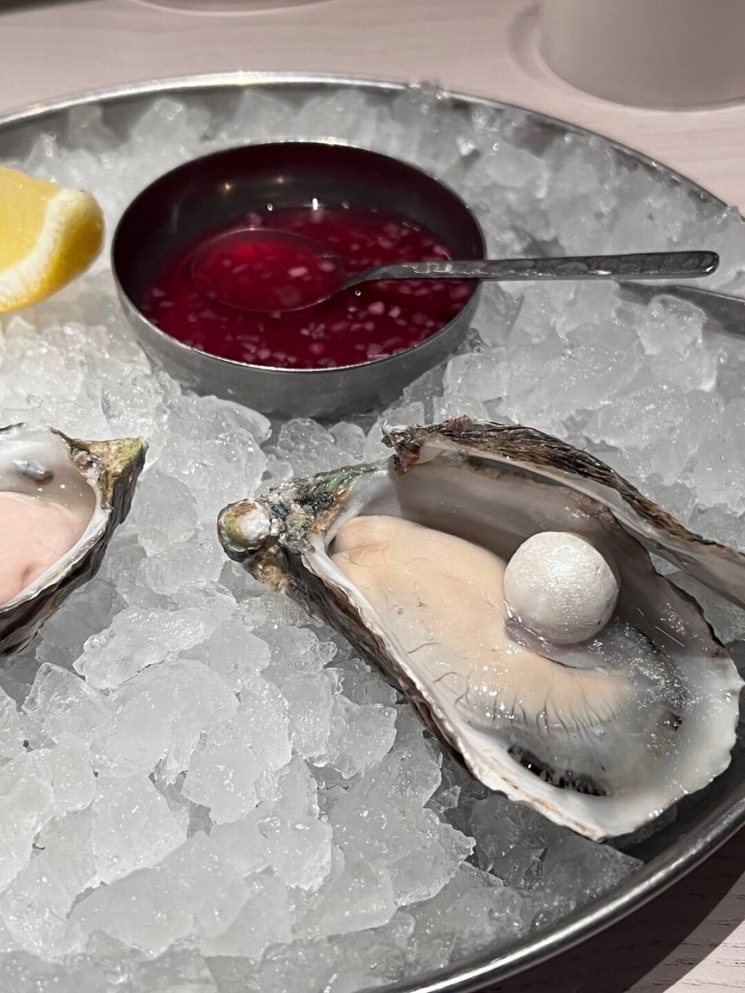 Устрица касабланка из Марокко в ресторане Мурада Бердиева Porto19. Фирменная подача — с жемчужиной из маракуйи и кокосового масла. А розовую джоли из Намибии пробуйте с винным уксусом, шалотом и лимоном.