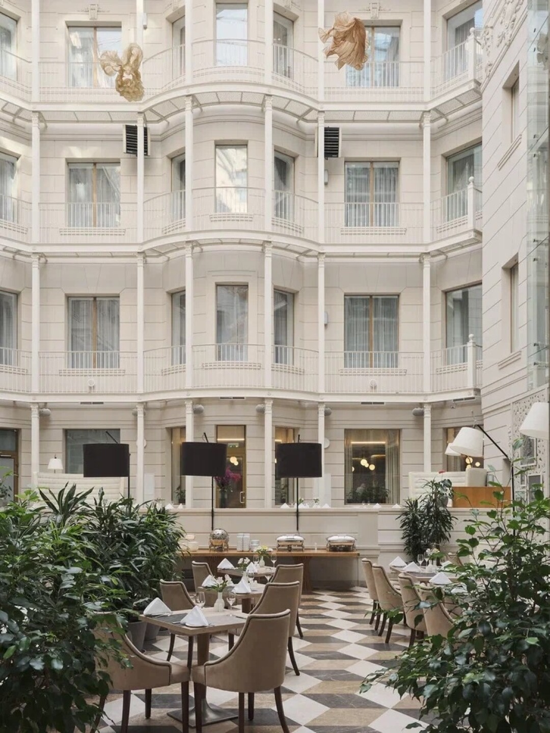 Цветы и зелень атриума — это то, что нужно утром. Шведский стол или а-ля карт, где must have — бенедикт «Дом со львами» с яйцом пашот, драники с авокадо, лососем и икрой лосося. Или петербургский завтрак в виде блинов Арины Родионовны — со сливочным муссом шантильи и вареньем из крыжовника.