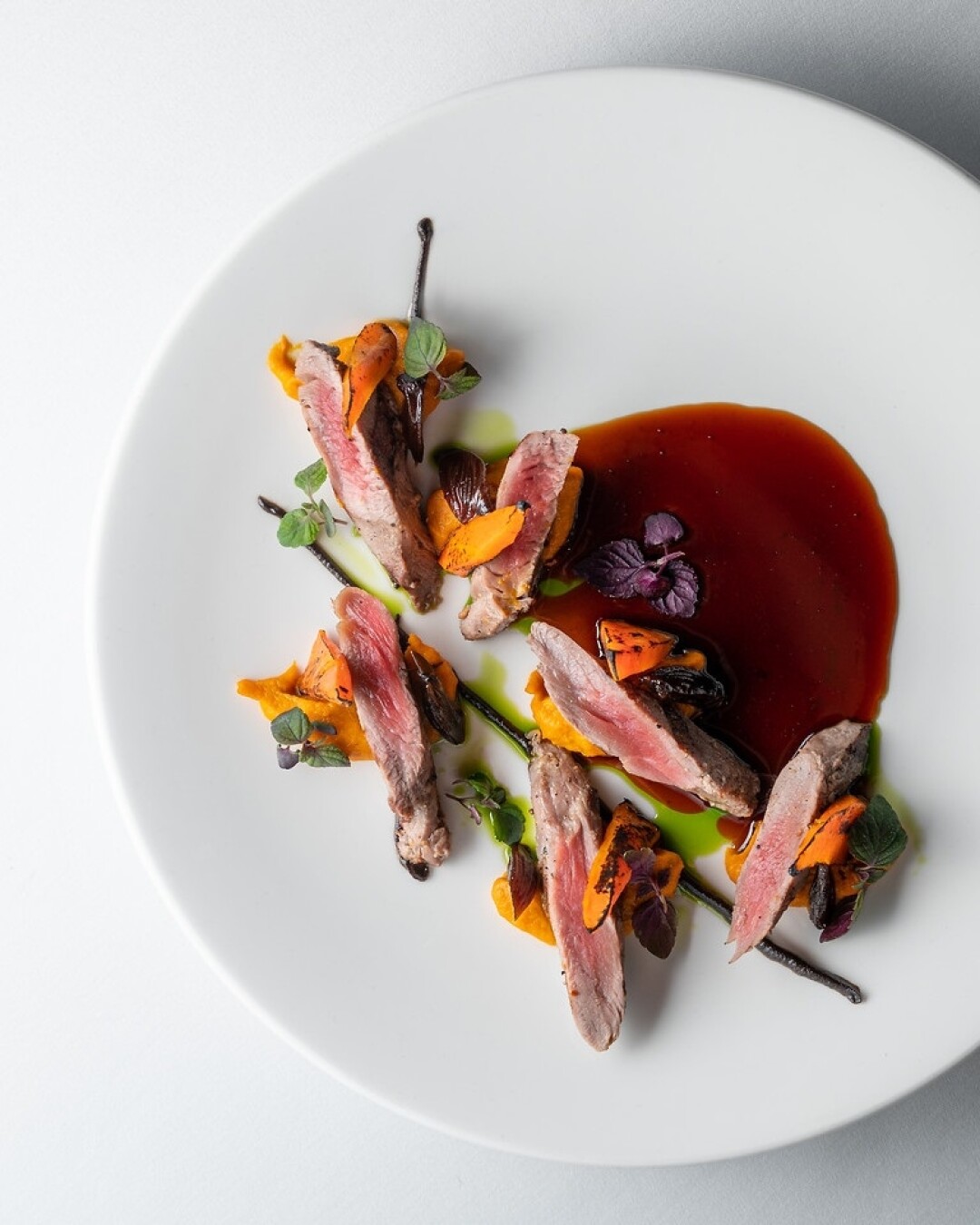 Первым основным курсом представят авторскую интерпретацию испанского супа гаспачо 3 микс свежих овощей со сладкой фалангой камчатского краба с мороженым из кинзы. Том ям же у шефа Артема Гребенщикова — в виде кальмара, фаршированного креветкой, с кремом из жареного картофеля на кокосовом молоке. А следующее блюдо посвящено петербургской кухне как феномену: в тарелке местная утка с пюре из овощей и ананасов с соусом из мясного сока с бобами тонка.
