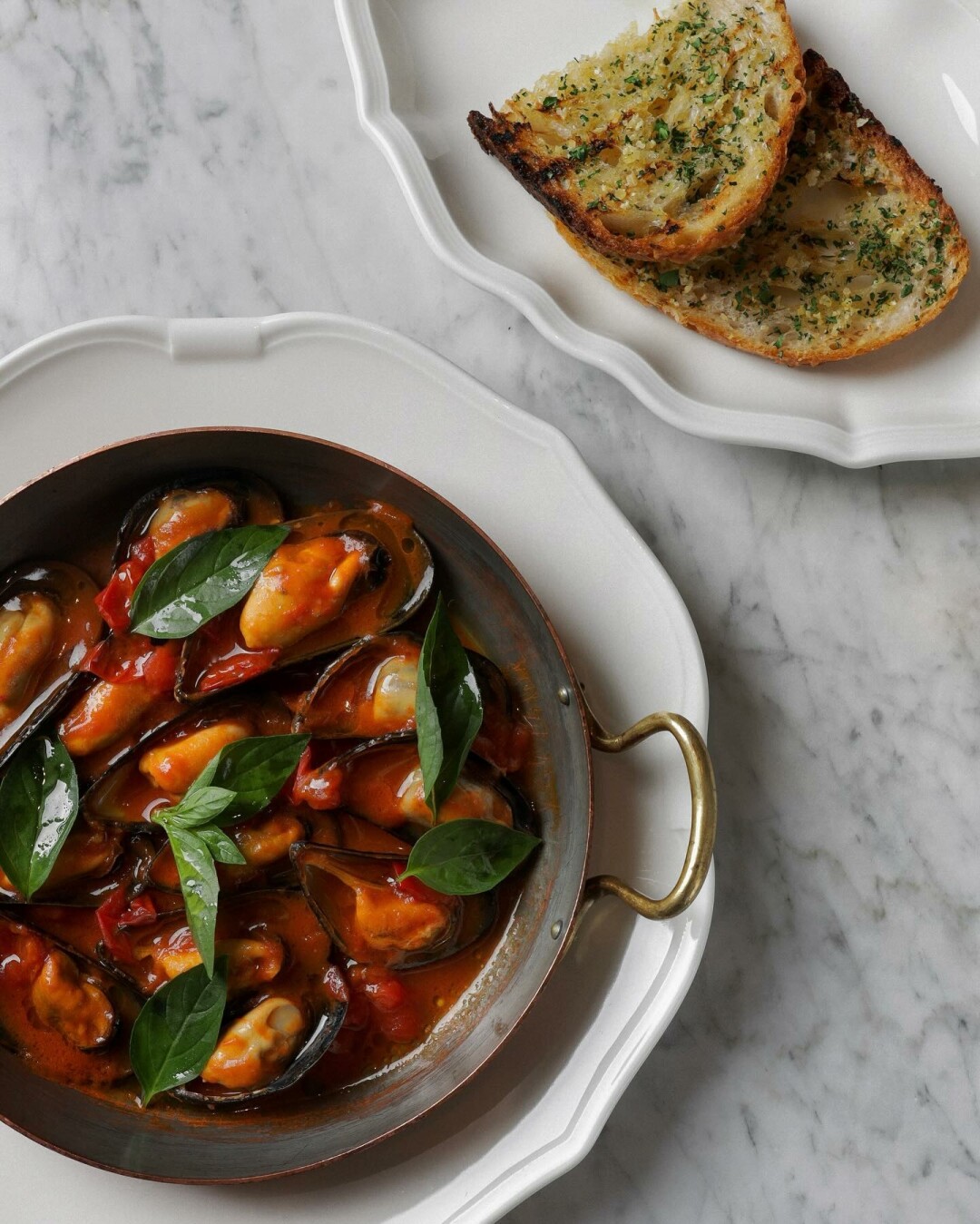 Возможно, стоимости базового качо-э-пепе добавляют картины российских художников галереи современного искусства «сцена / szena» или темное дерево винной комнаты, расписанный вручную журнальный столик или потолок из шпона американского ореха. Однако ради этих мидий с кремом из пряных томатов и чесночным хлебом мы готовы на все!