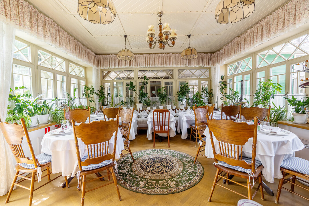 В усадьбе легендарной Анны Вырубовой, фрейлины императрицы Александры Федоровны, устраиваемся на нарядной веранде, гуляем по парку, гладим местную кошку и занимаем лежаки на берегу. Пляжным и имперским вайбам соответствует и меню: скумбрия на ольховых опилках — собственного копчения, подают эклеры с рыбой, хрустящие пирожки с уткой и ром-бабу с земляникой.