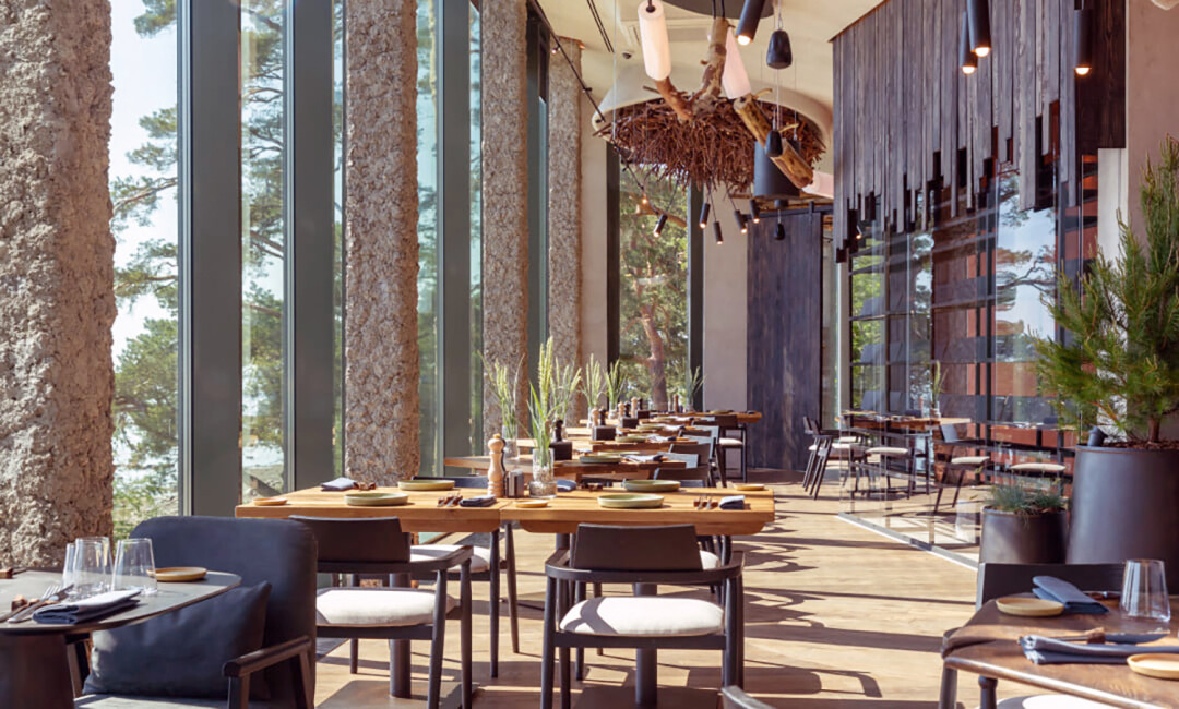 В парк-отеле Sorola Village ресторан Skala идеально вписался в ландшафт, а именно в Змеиную гору, что на берегу Ладожского озера (из этой же скалы вырубили гранитную плитку для интерьера). Местный шеф отправляет карельские продукты и рецепты в гастрономический космос, на орбиту new nordic cuisine: калитки пекут с тунцом или ростбифом, оленину подают с копченым гратеном и гранатовым демиглясом, а ладожского судака — с карельскими травами, маринованными груздями и польским соусом.