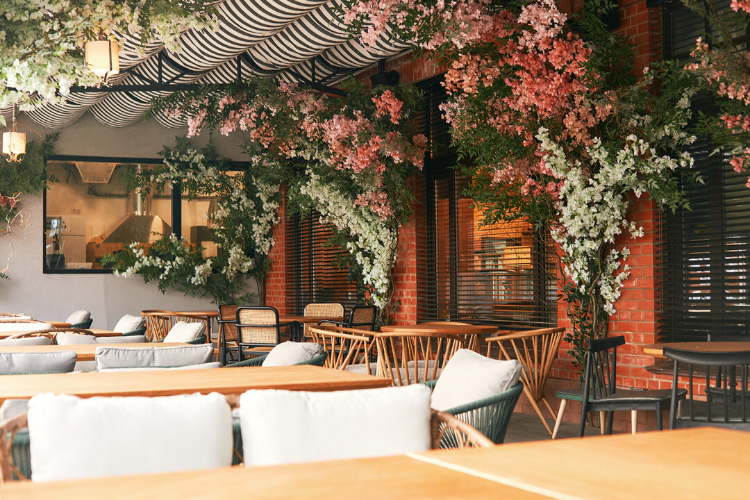 Под увитыми вечной зеленью перголами кормят затейливо: пиццей с кроликом и печеной тыквой, равиолями с говяжьим языком и трюфелем, тальятой с пюре из пастернака и перечным соусом.