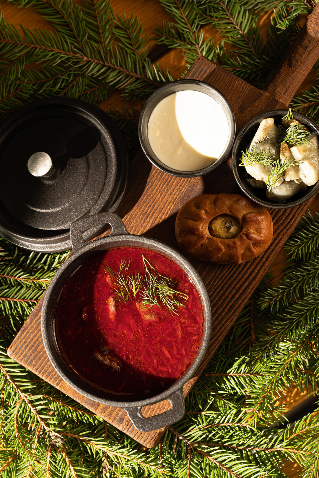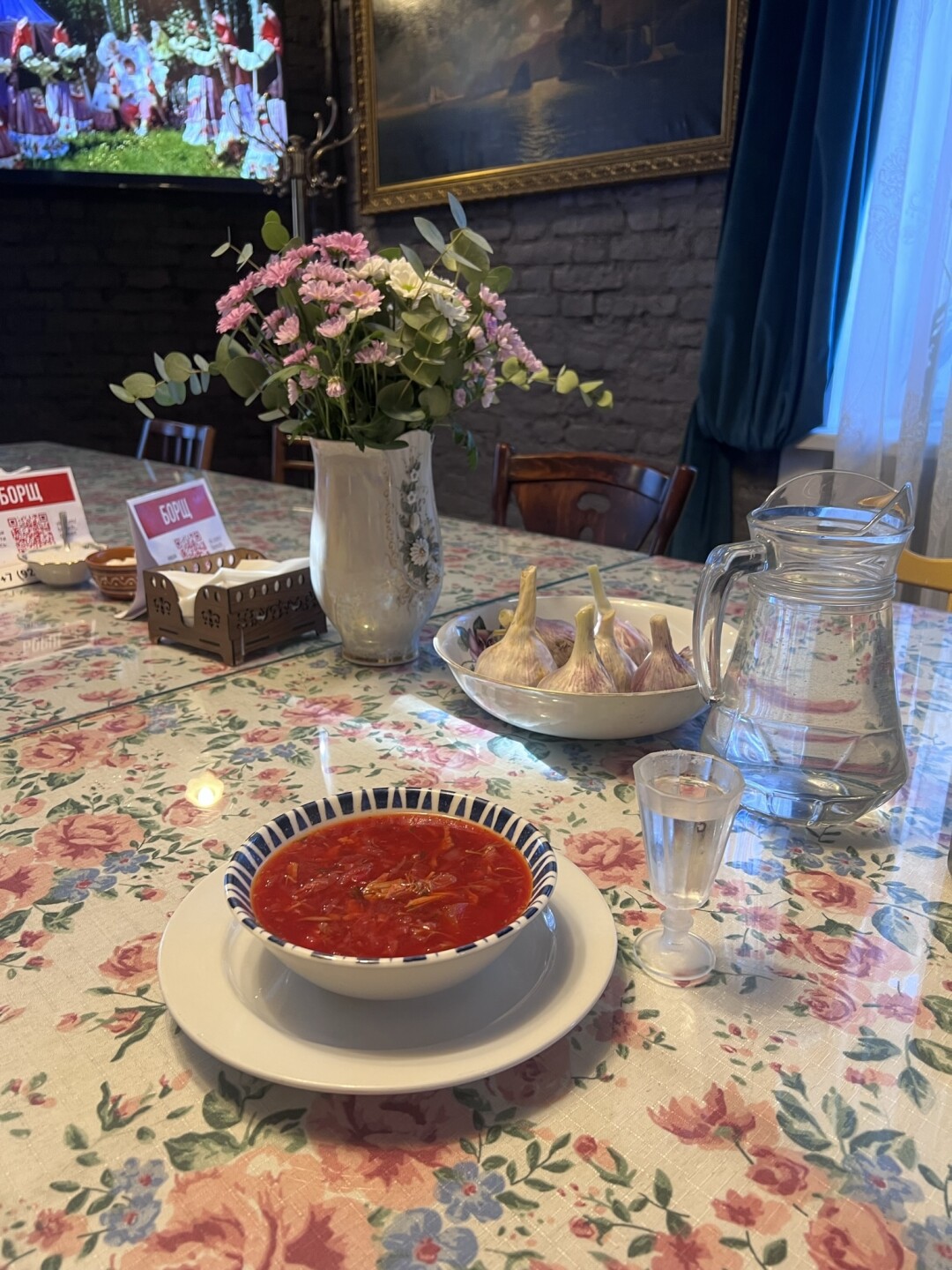 Воссозданная крестьянская деревня (и гениальная туристическая локация) уникальна не только своей природой и географией, но и рестораном в духе трапезных палат старорусского двора. И перед, и после визита в местный музей водки подкрепляемся моченой брусникой, маринованными груздями, фирменным зельцем, боярскими блинами и самолепными ушками с олениной или щукой.