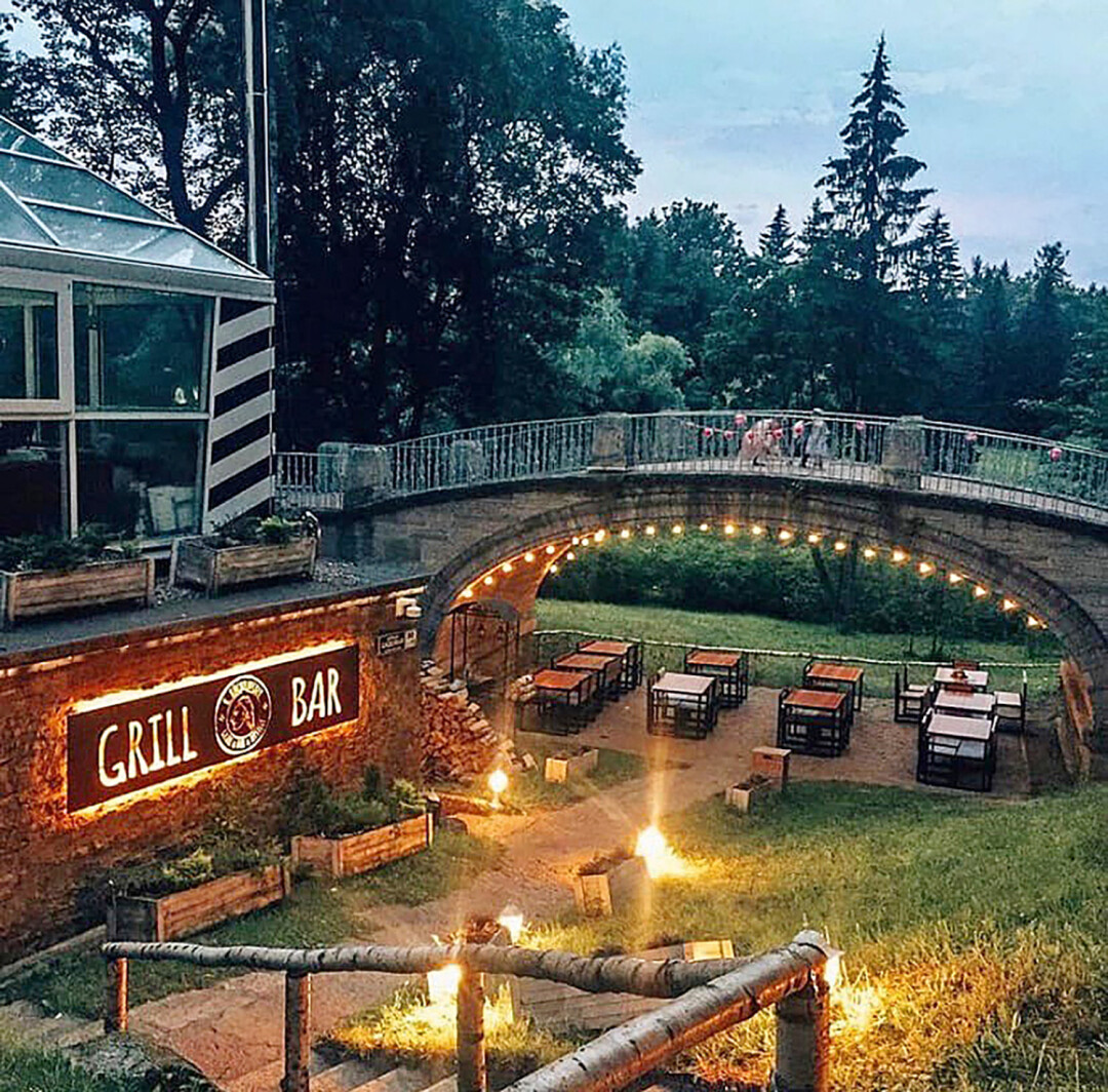 Демократичное гриль-кафе в роскошном пейзажном Павловском парке (рядом с памятником Павлу I) заняло помещение ледника (да, это аналог холодильника!). Замерзнуть тут не получится, а вот согреться после осмотра дворца, построенного архитектором Винченцо Бренна, шашлыком, бургером, колбасками на сказочной террасе под Северным мостом — вполне.
