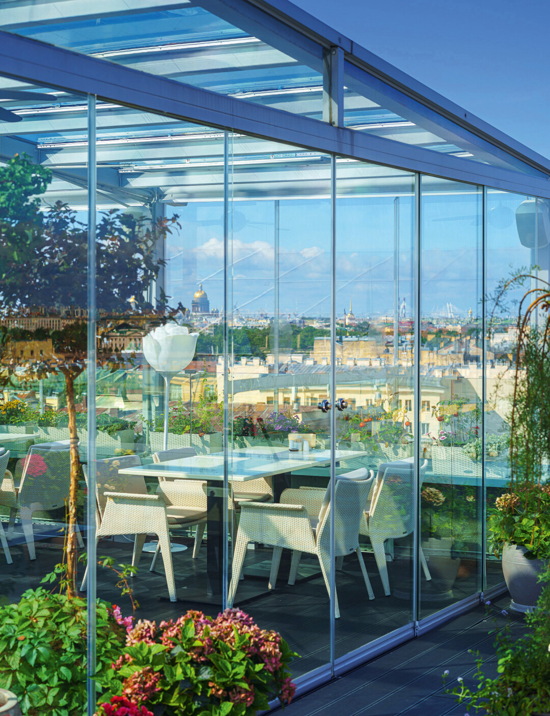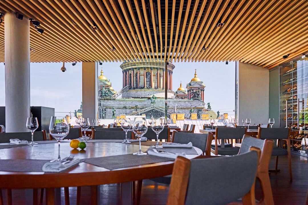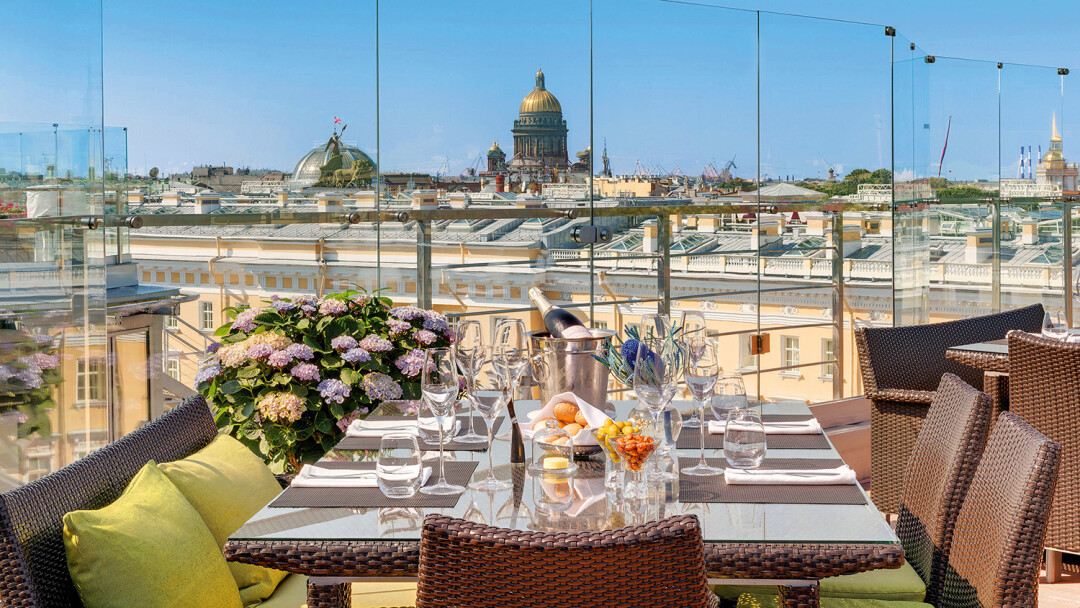 «Город нас обнимает!» — восторженно кричат гости ресторана высокой кухни на крыше «Гранд Отеля Мойка, 22», выйдя на террасу. И это, поверьте, крепкие объятия — на все 360° видна небесная линия Петербурга. Здесь с видом на Александрийский столп и Петропавловский собор обустроены две пленэр-площадки для парадных ужинов, а еще отдельный панорамный бар с музыкой и танцами: среди белых гортензий апероль льется рекой — базиликовый, с квасом (!) и классический на кране.