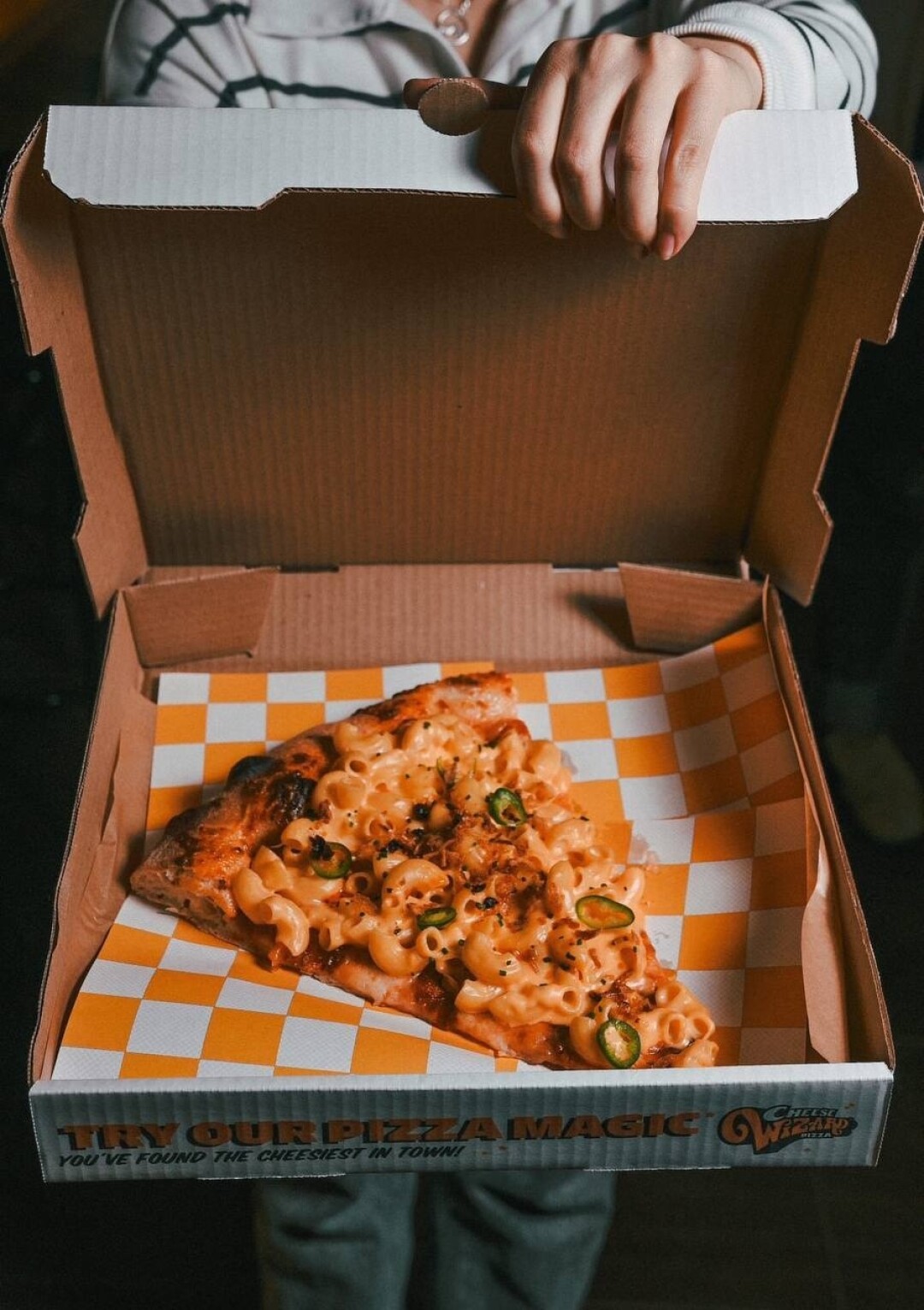 В царстве странной еды — в пиццерии Cheese wizard — появилась пицца с макаронами. В составе настоящий мак-энд-чиз — американское блюдо со сливочным соусом, плотной порцией макарон и сыра.
