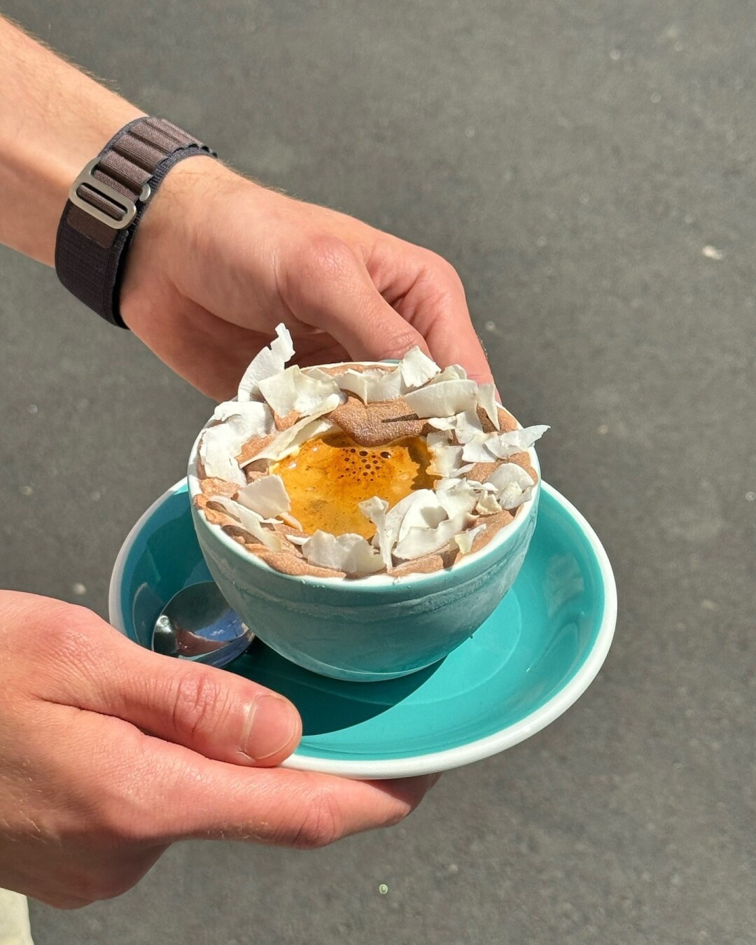«Баунти» — напиток-десерт, оммаж на аффогато «Сникерс» из 2023-го. Кокосовый джелато, тонкая корочка из шоколада от Amazing Cacao, кокосовые чипсы и эспрессо.