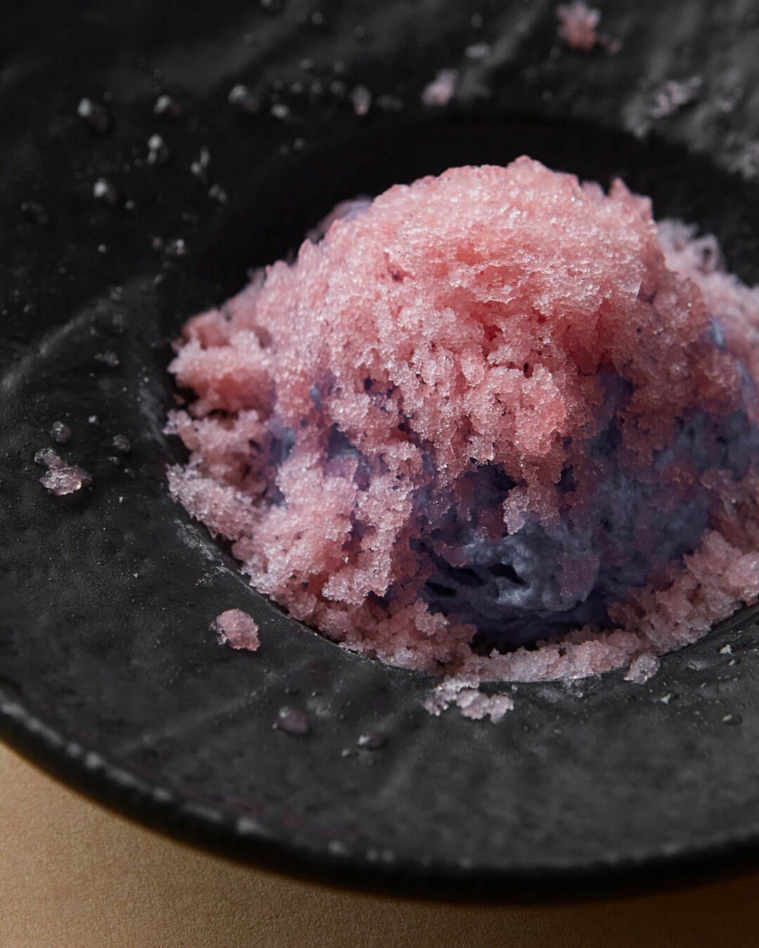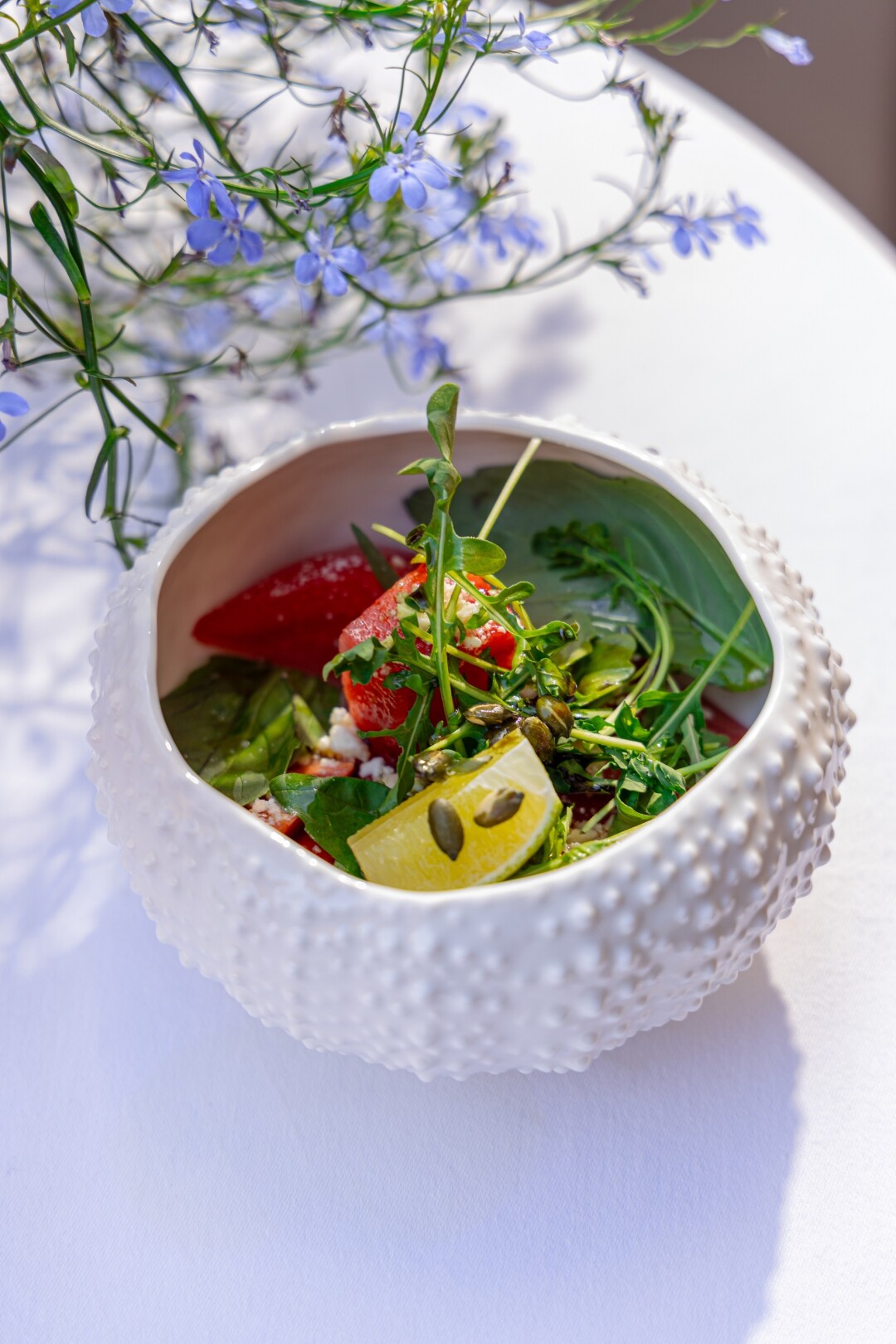В последнем сете от шеф-повара Валерии Скуратовой ищите блюдо самых красивых оттенков. Это граните из арбуза с кешью-пастой и муссом из синей матчи. «Если бы летняя влюблённость имела вкус и текстуры, она бы выглядела именно так», — поясняет Лера.